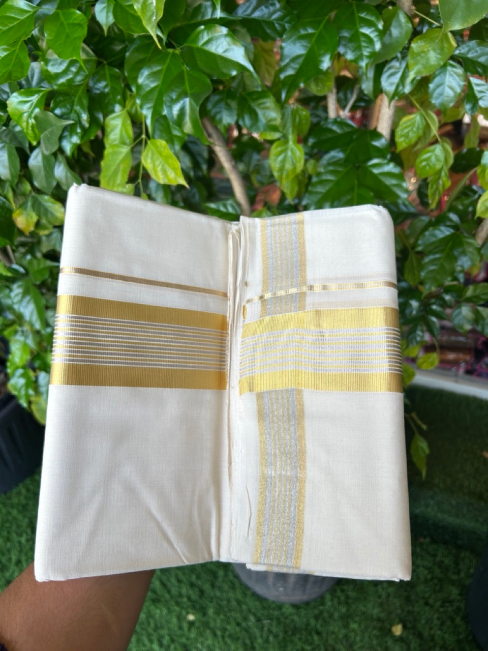 25% DISCOUNT ! KaithariKada HANDLOOM MILLPAAV Balaramapuram - 100% PURE Cotton Off White (Unbleached) Double Mundu/Dhoti - 80X90 - 2.25 inch Gold Kasavu & Silver Kasavu Stripes Kara 4 mtr (8.5 muzham)- 28KK5234 RAM