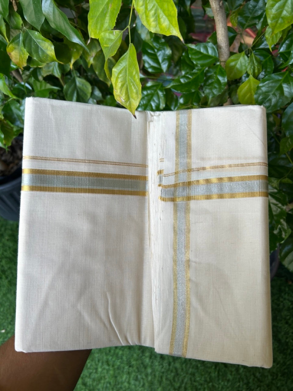 25% Discount ! KaithariKada HANDLOOM MILLPAAV Balaramapuram - 100% PURE Cotton Off White - (Unbleached) Double Mundu/Dhoti - 80X90 - 1 inch Gold Kasavu & Silver Kasavu Stripes Kara 4 mtr (8.5 muzham) - 31KK5234 RAM