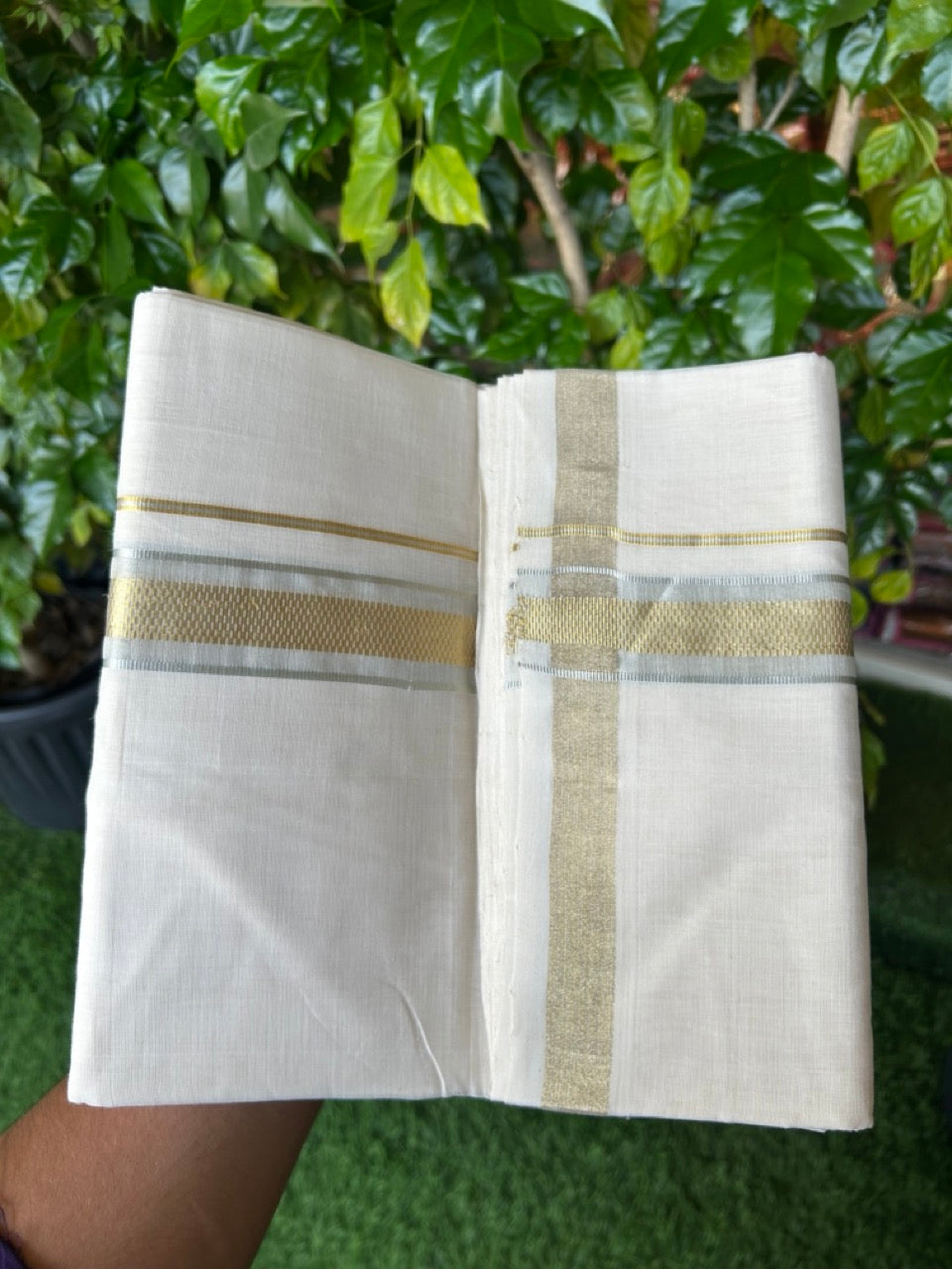 25% DISCOUNT ! KaithariKada HANDLOOM UNAKKUPAAV Balaramapuram - 100% PURE Cotton Off White - (Unbleached) Double Mundu/Dhoti - 80X90 - 1.5 inch Gold Kasavu & Silver Kasavu Jacquard Kara 4 mtr (8.5 muzham) - 48 KK5234 RAM