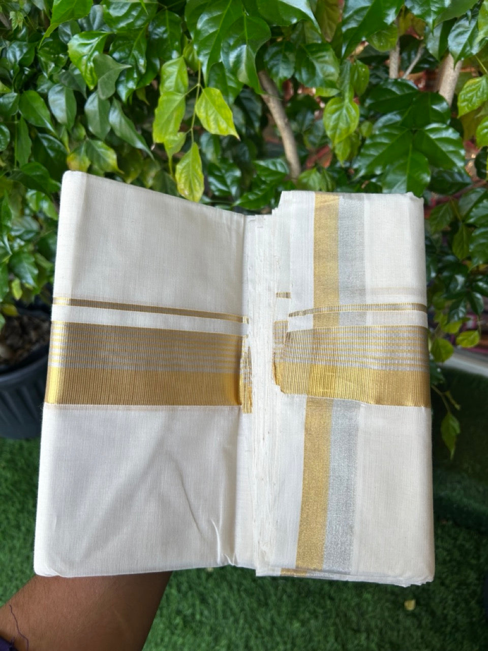 25% DISCOUNT ! KaithariKada HANDLOOM MILLPAAV Balaramapuram - 100% PURE Cotton Off White - (Unbleached) Double Mundu/Dhoti - 80X90 - 2 inch Gold Kasavu & Silver Kasavu Stripes Kara 4 mtr (8.5 muzham)- 29KK5234 RAM