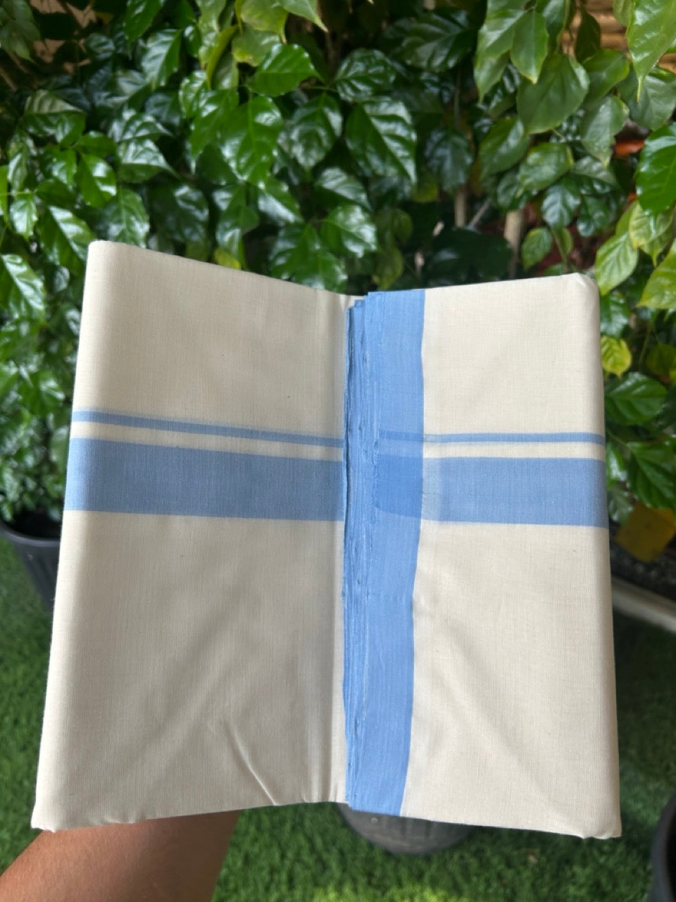 25% Discount ! KaithariKada Handloom Millpaav Balaramapuram - 100% PURE Cotton OFF White (Unbleached) Double Mundu/Dothi - 80x90 - 1 inch Light Blue Mulloth Kara 4 Meters (8.5 Muzham) - 6 KK5256 RAM
