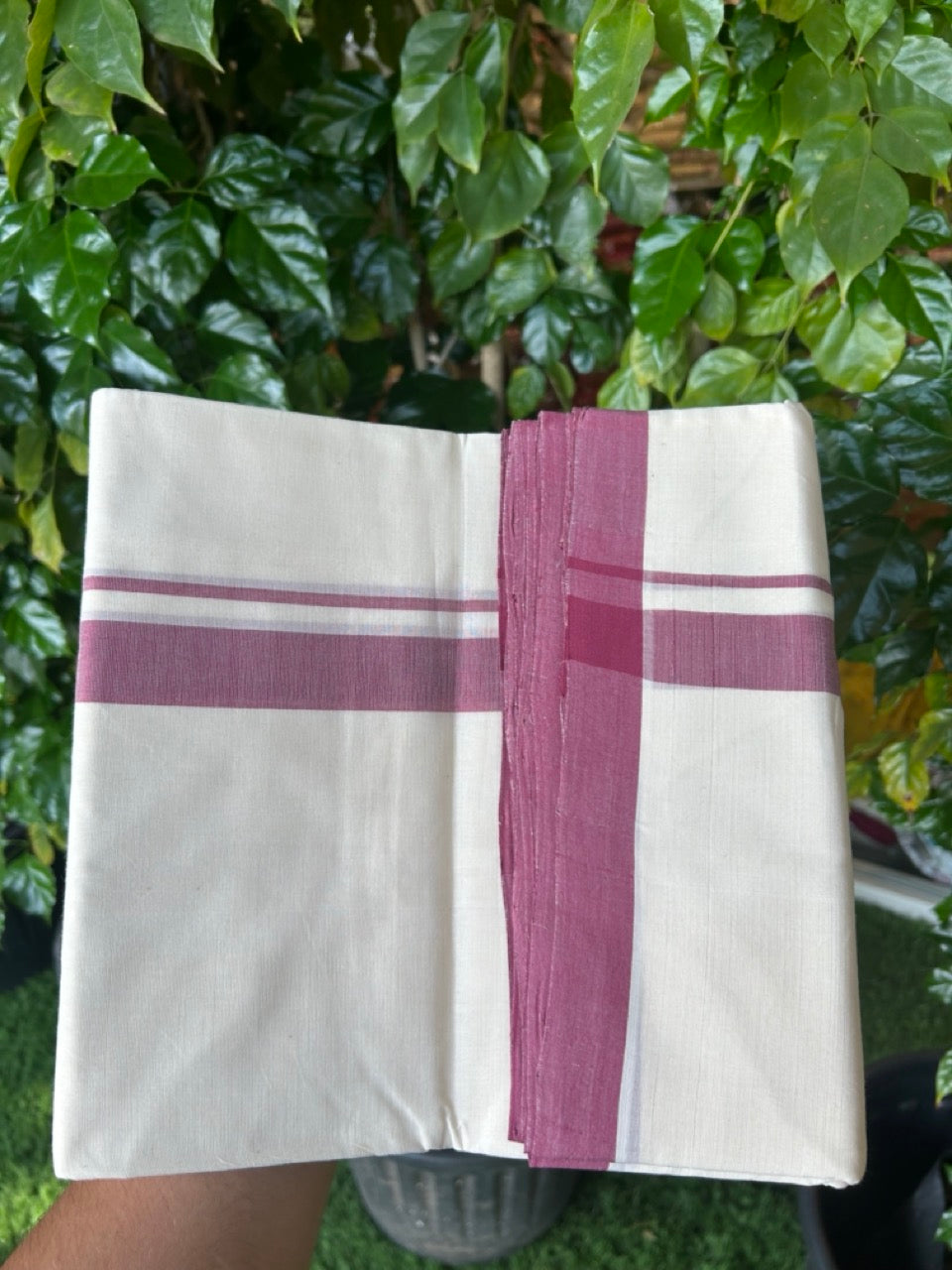 25% Discount ! KaithariKada Handloom Millpaav Balaramapuram - 100% PURE Cotton OFF White (Unbleached) Double Mundu/Dothi - 80x90 - 1 inch Dull Magenta Mulloth Kara 4 Meters (8.5 Muzham) - 4 KK5256 RAM