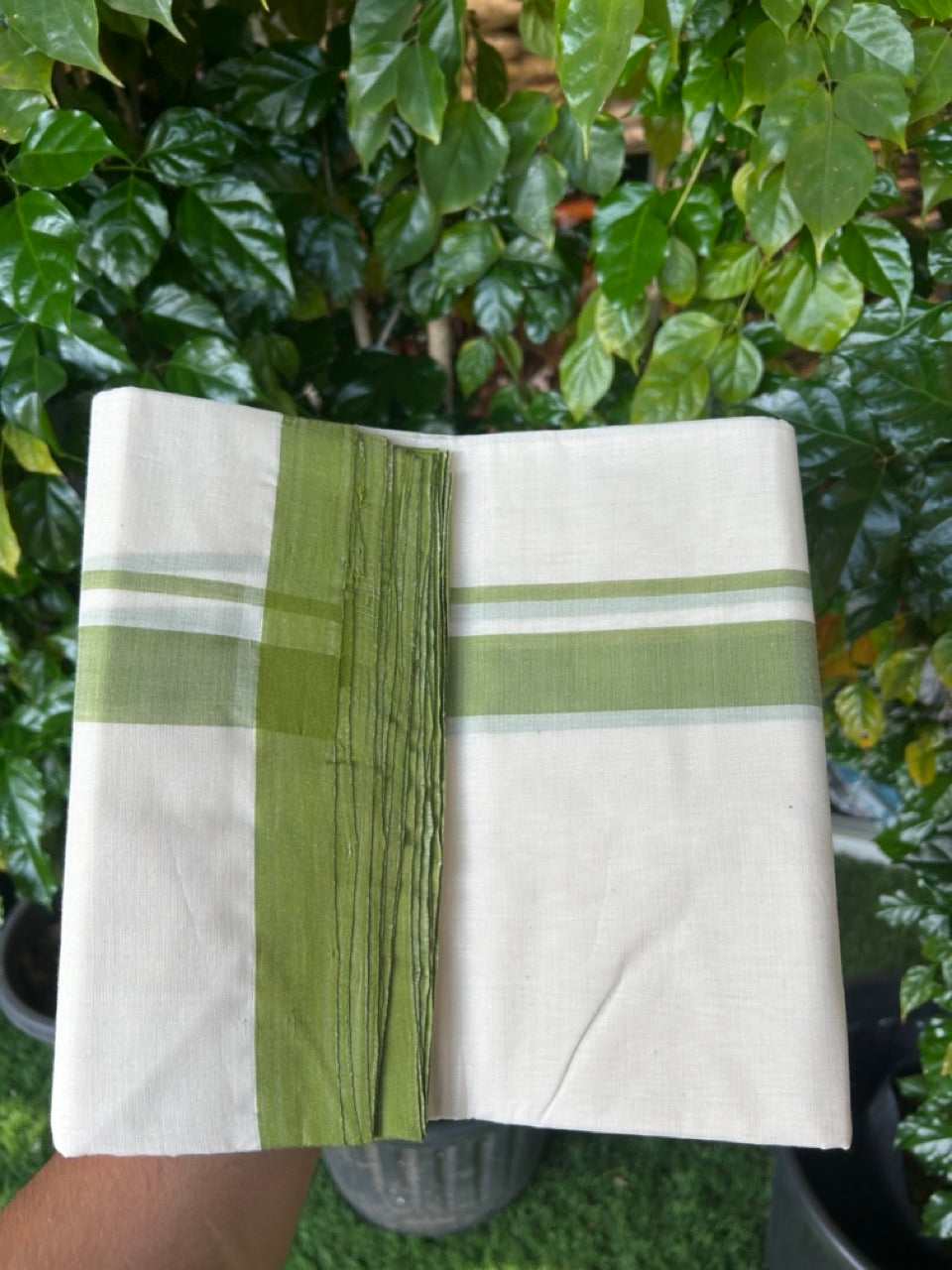 25% Discount ! KaithariKada Handloom Millpaav Balaramapuram - 100% PURE Cotton OFF White (Unbleached) Double Mundu/Dothi - 80x90 - 1.25 inch Light Green Mulloth Kara 4 Meters (8.5 Muzham) - 3 KK5256 RAM