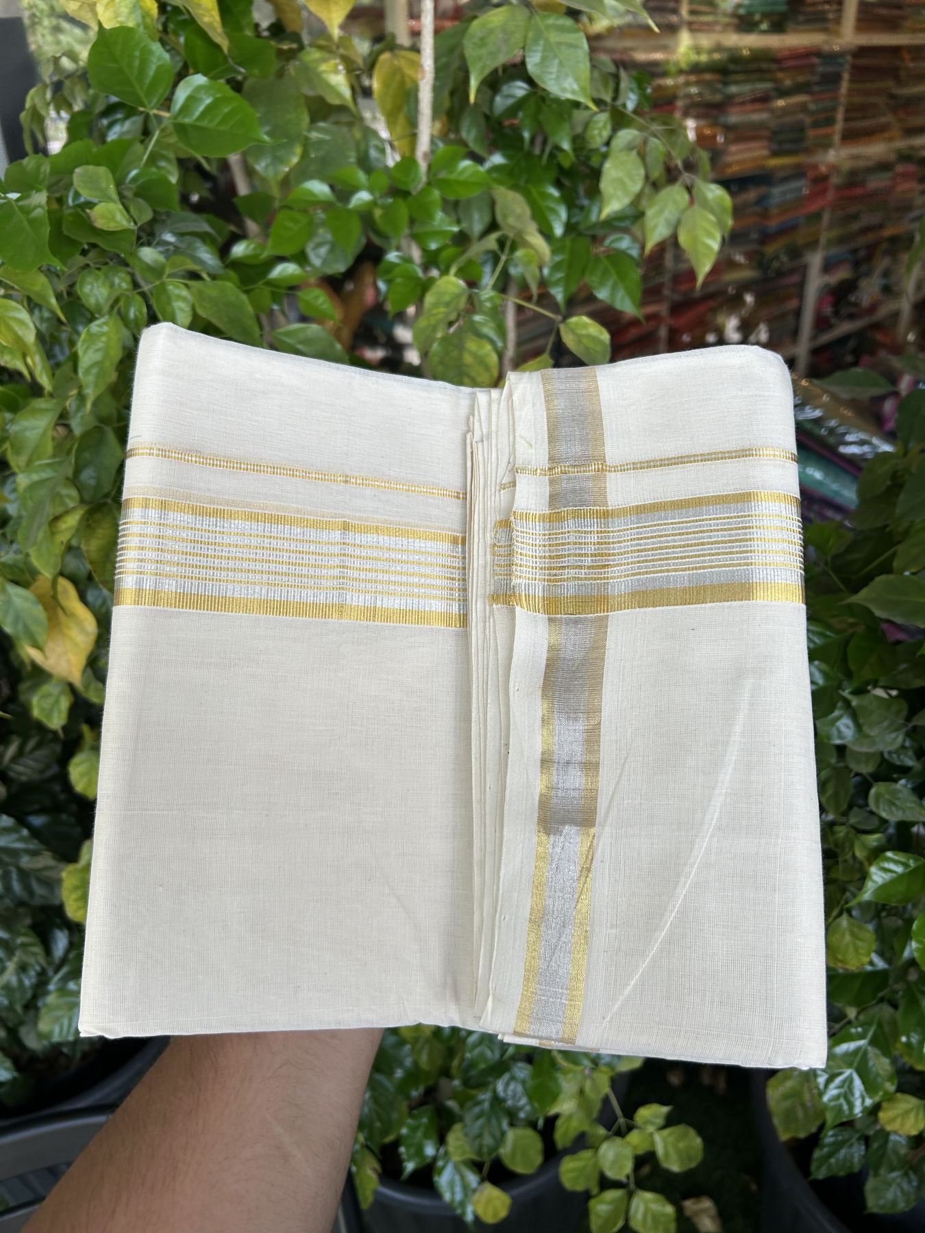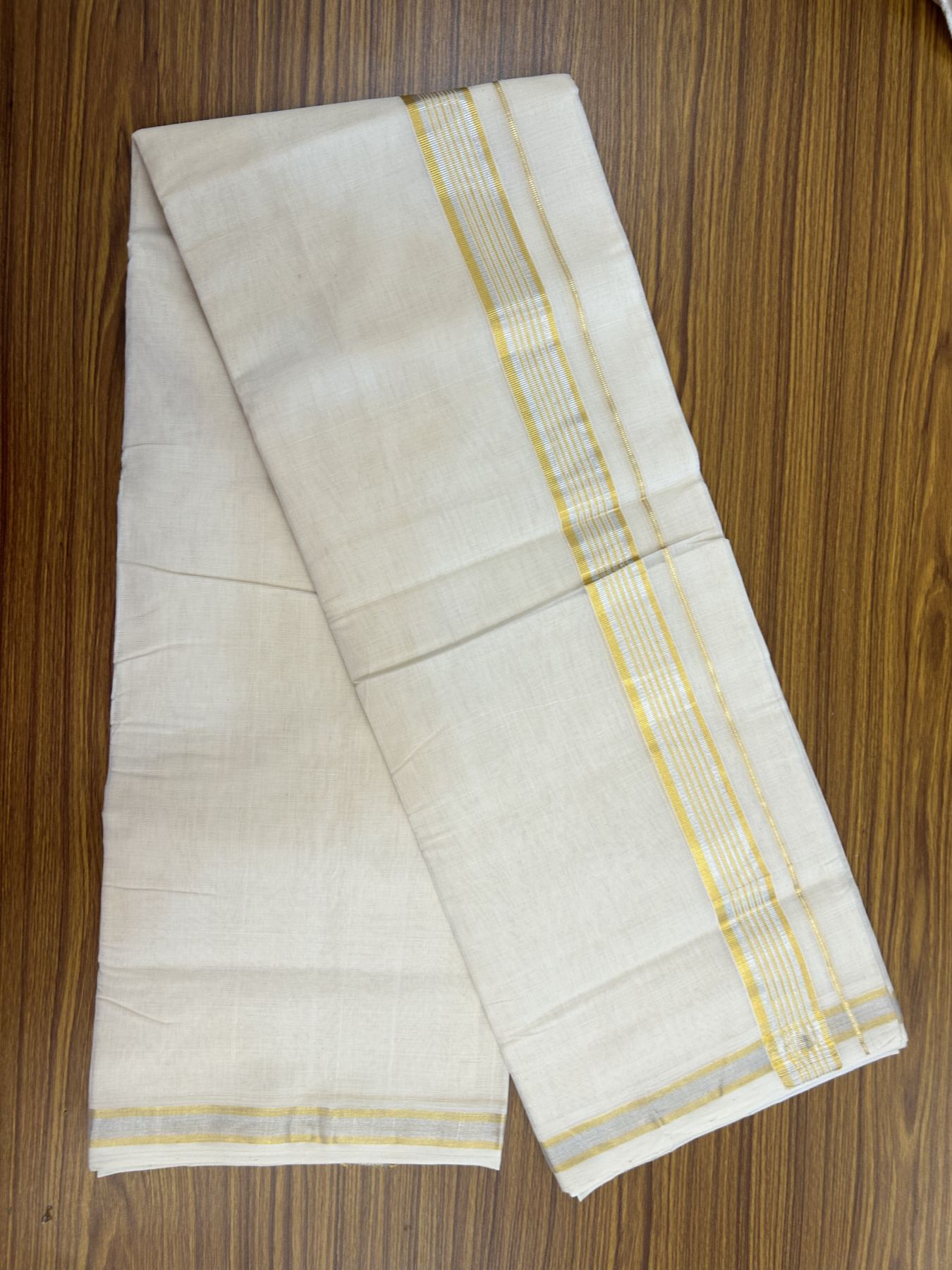 25% Discount ! KaithariKada Handloom Millpaav - Kerala Handloom - 100% Pure Cotton Off White (Unbleached) Double Mundu/Dhoti - 80x90 - 1.5 inch Gold Kasav & Silver Kasav striped Kara 4 mtr (8.5 Muzham) - 35 KK5337 RAM