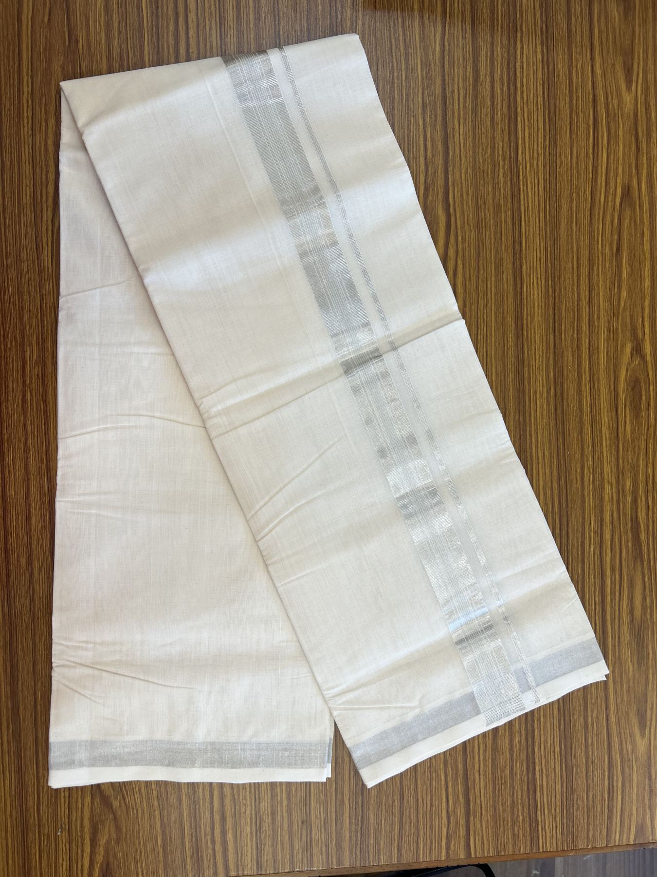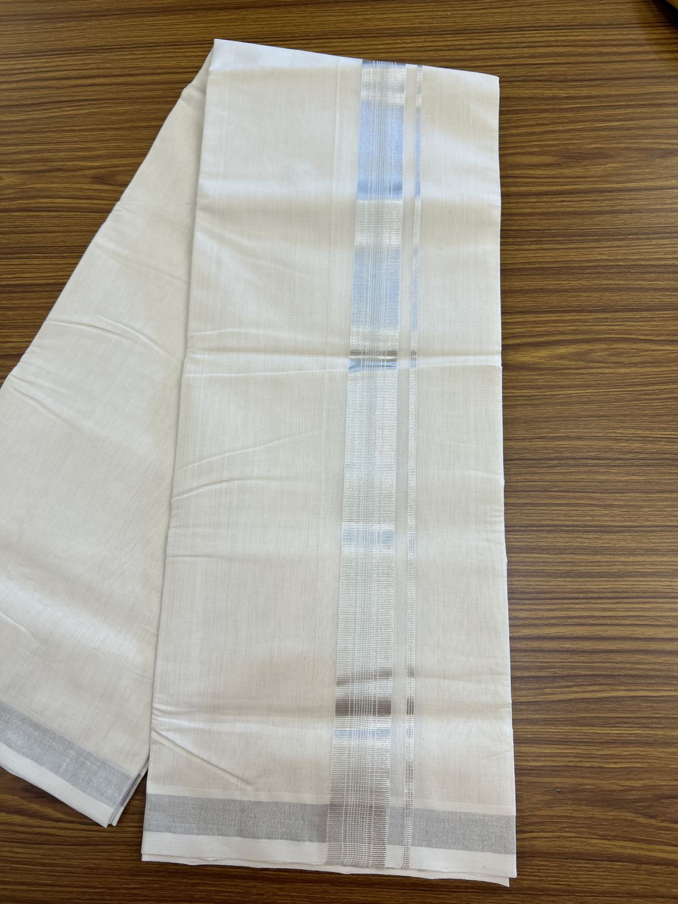 25% Discount ! KaithariKada Handloom Millpaav - Kerala Handloom - 100% Pure Cotton Off White (Unbleached) Double Mundu/Dhoti - 80x90 - 1.5 inch Silver Kasav striped Kara 4 mtr (8.5 Muzham) - 38 KK5337 RAM