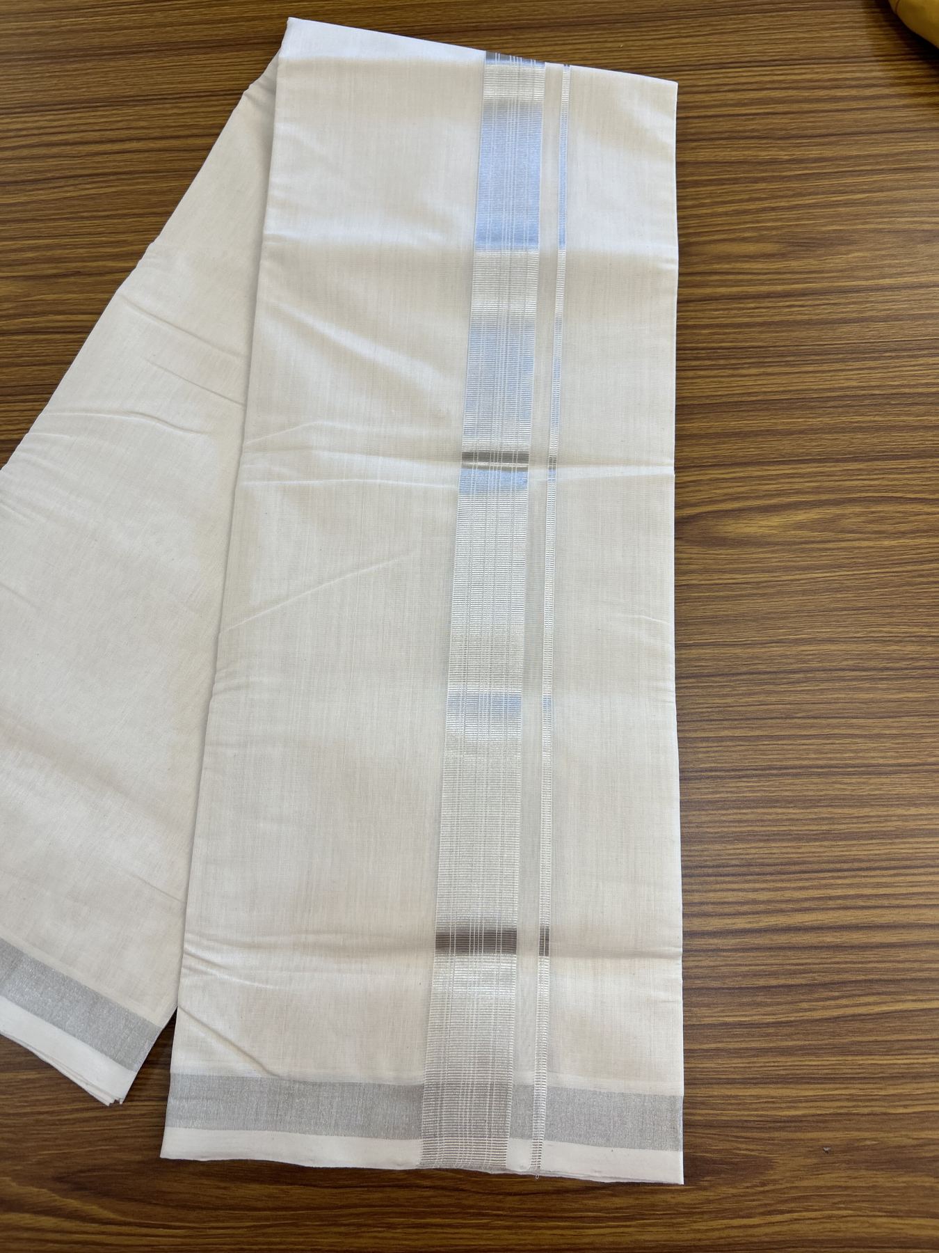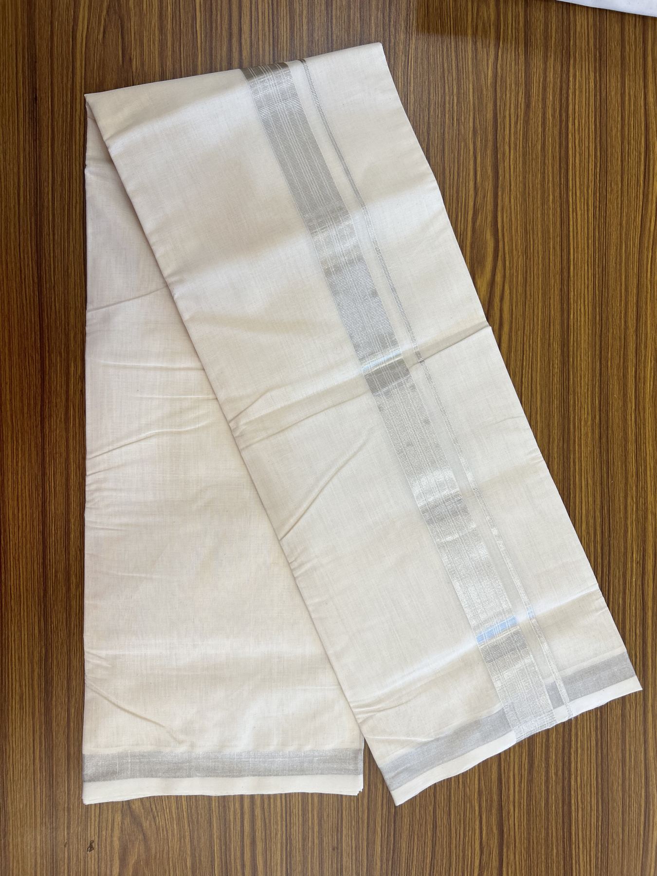 25% Discount ! KaithariKada Handloom Millpaav - Kerala Handloom - 100% Pure Cotton Off White (Unbleached) Double Mundu/Dhoti - 80x90 - 1.5 inch Silver Kasav striped Kara 4 mtr (8.5 Muzham) - 39 KK5337 RAM