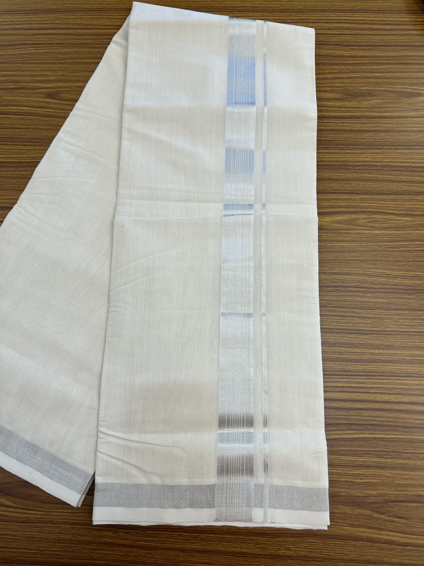 25% Discount ! KaithariKada Handloom Millpaav - Kerala Handloom - 100% Pure Cotton Off White (Unbleached) Double Mundu/Dhoti - 80x90 - 1.5 inch Silver Kasav striped Kara 4 mtr (8.5 Muzham) - 40 KK5337 RAM