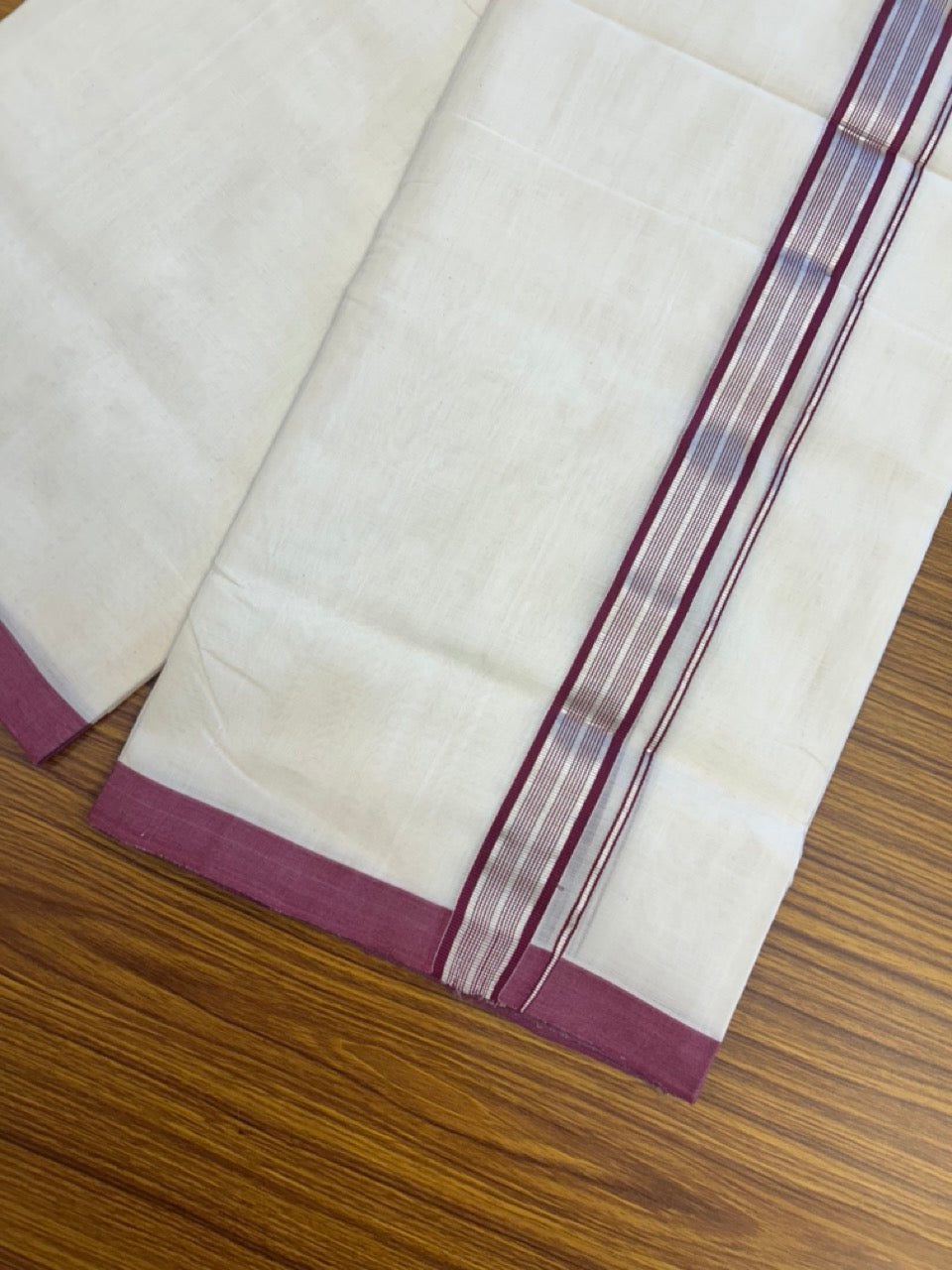 25% Discount ! Kaitharikada Handloom Unakkupaav Balaramapuram - 100% Pure Cotton Off White - (Unbleached) Double Mundu/Dhoti - 100x80 - 1.25 inch Silver Kasav & Wine Purple Striped Kara 4 mtr (8.5 Muzham) - 3 KK5307 SAS