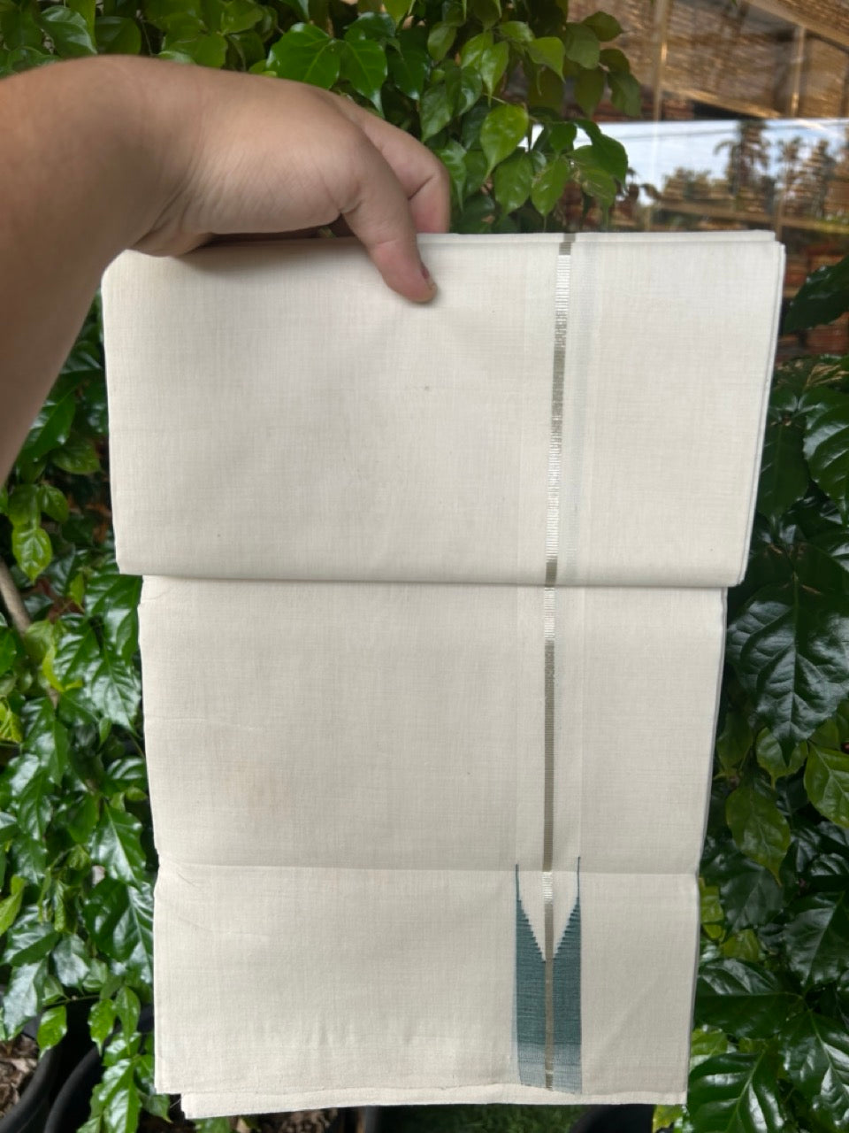 25% Discount!!! KaithariKada HANDLOOM UNAKKUPAAV Balaramapuram - 100% PURE Cotton OFF WHITE (Unbleached) Double Mundu/Dhoti - 80x90 - 1 inch Silver kasavu Green shaded chutty 4 Mtr (8.5 Muzham) - 16KK5235 YAR