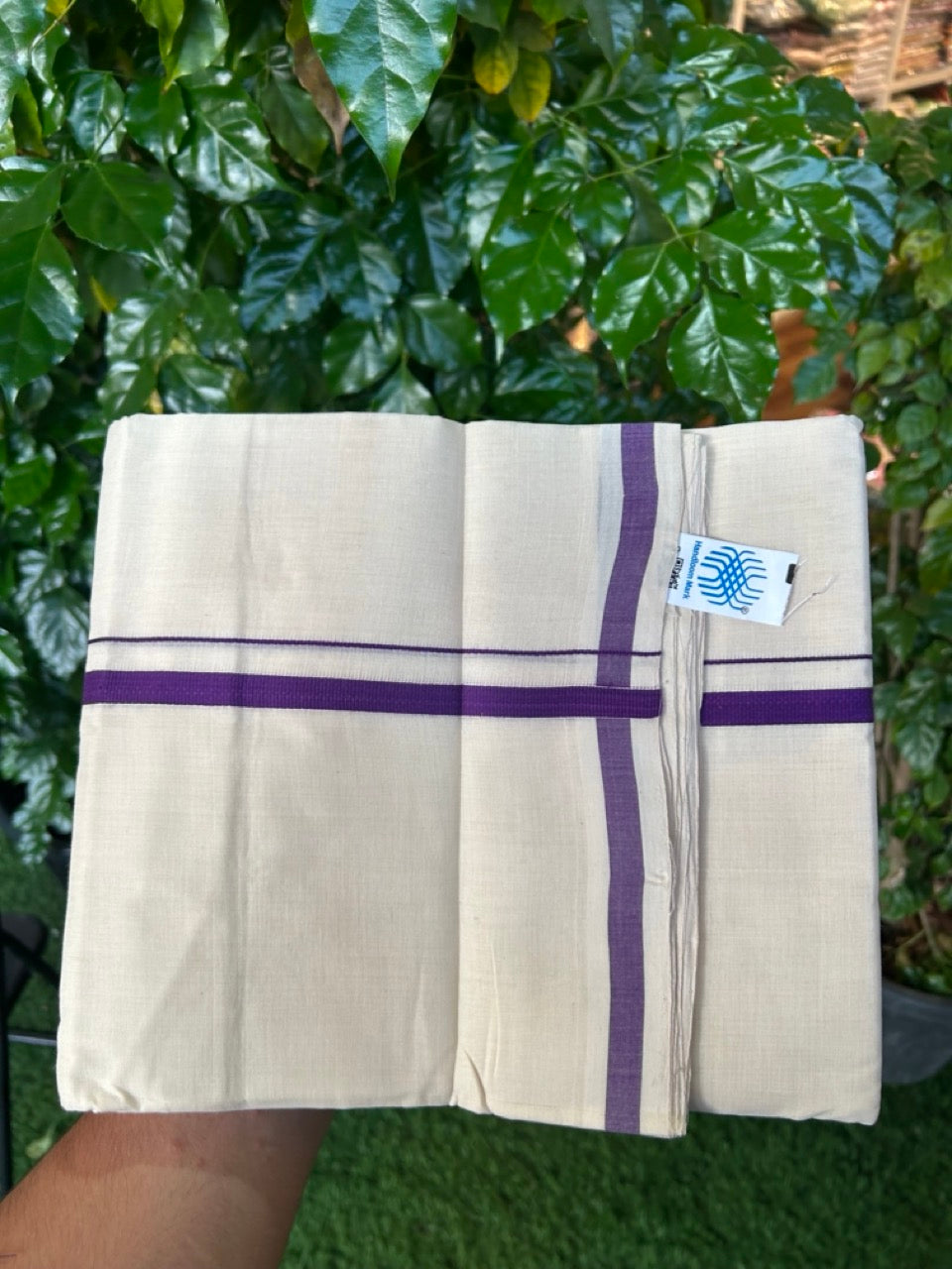 25% Discount KaithariKada Handloom Unakkupaav Balaramapuram - 100% PURE Cotton off white (Unbleached) Double Mundu/Dhoti - 80X90 - 1 cm Violet Kara 3.80 mtr (8 muzham) - 13 KK5260 ELA