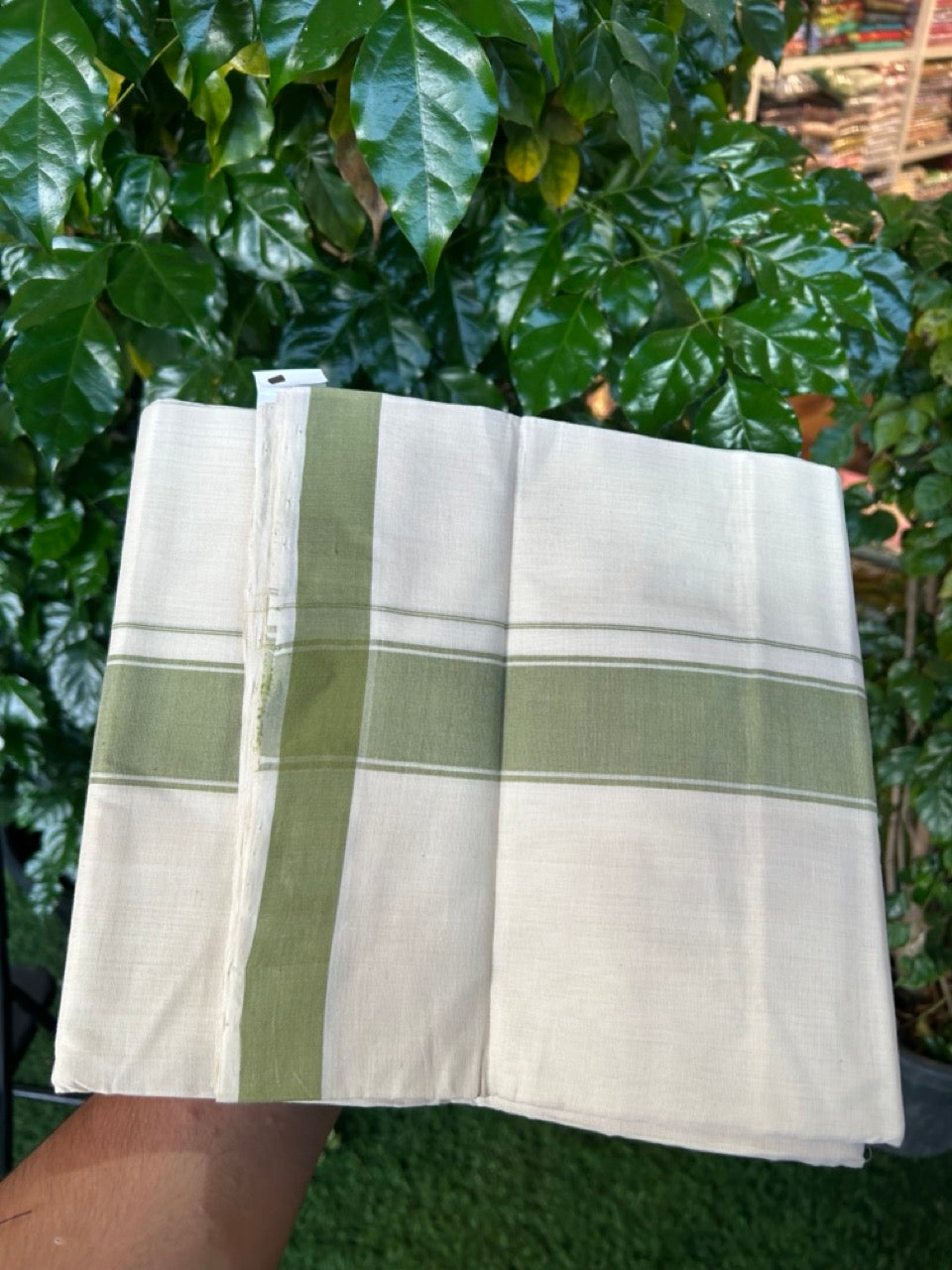 25% Discount KaithariKada Handloom Unakkupaav Balaramapuram - 100% PURE Cotton off white (Unbleached) Double Mundu/Dhoti - 80X90 - 1.75 inch Green Shaded Striped Kara 3.80 mtr (8 muzham) - 7 KK5260 ELA