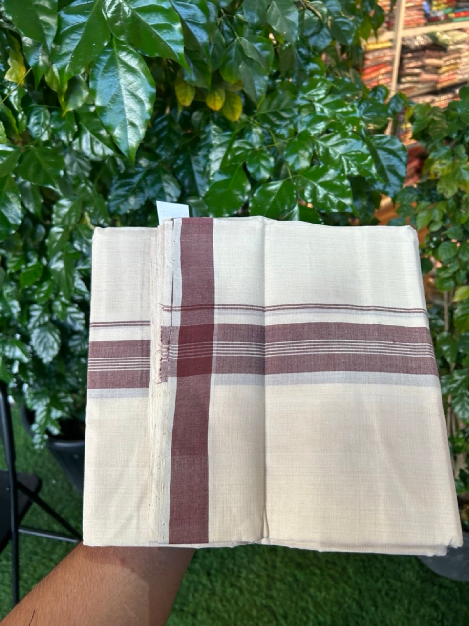 25% Discount KaithariKada Handloom Unakkupaav Balaramapuram - 100% PURE Cotton off white (Unbleached) Double Mundu/Dhoti - 80X90 - 1.5 inch Brown Striped Kara 3.80 mtr (8 muzham) - 9 KK5260 ELA