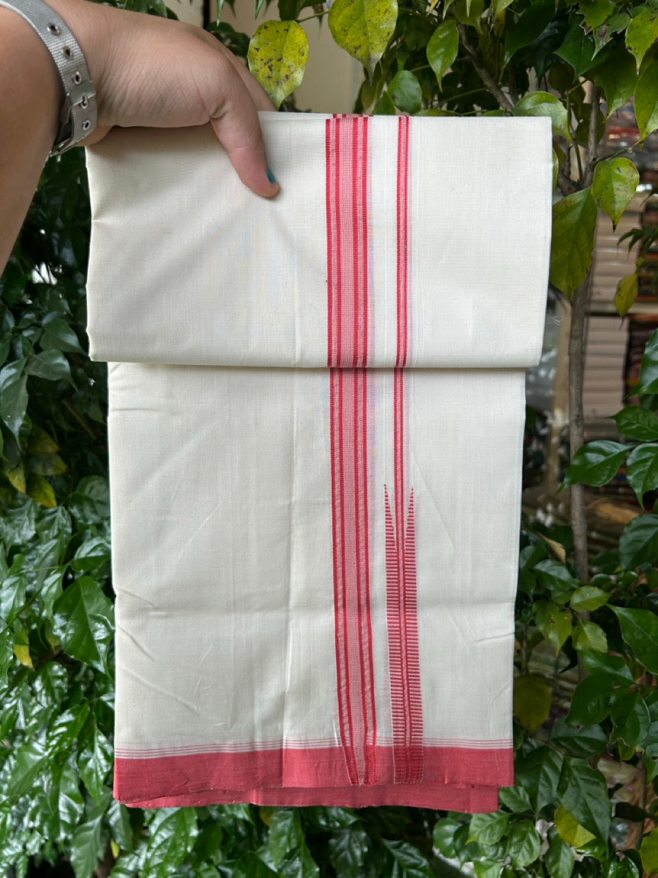 25% DISCOUNT!! KaithariKada HANDLOOM UNAKKUPAAV Balaramapuram - 100% PURE Cotton OFF White - (Unbleached) Double Mundu/Dothi - 100 x 80 - 0.75 inch Pink Red Chutty Kara 3.85 meter (8.5 mulam) - 8 KK5249 REA