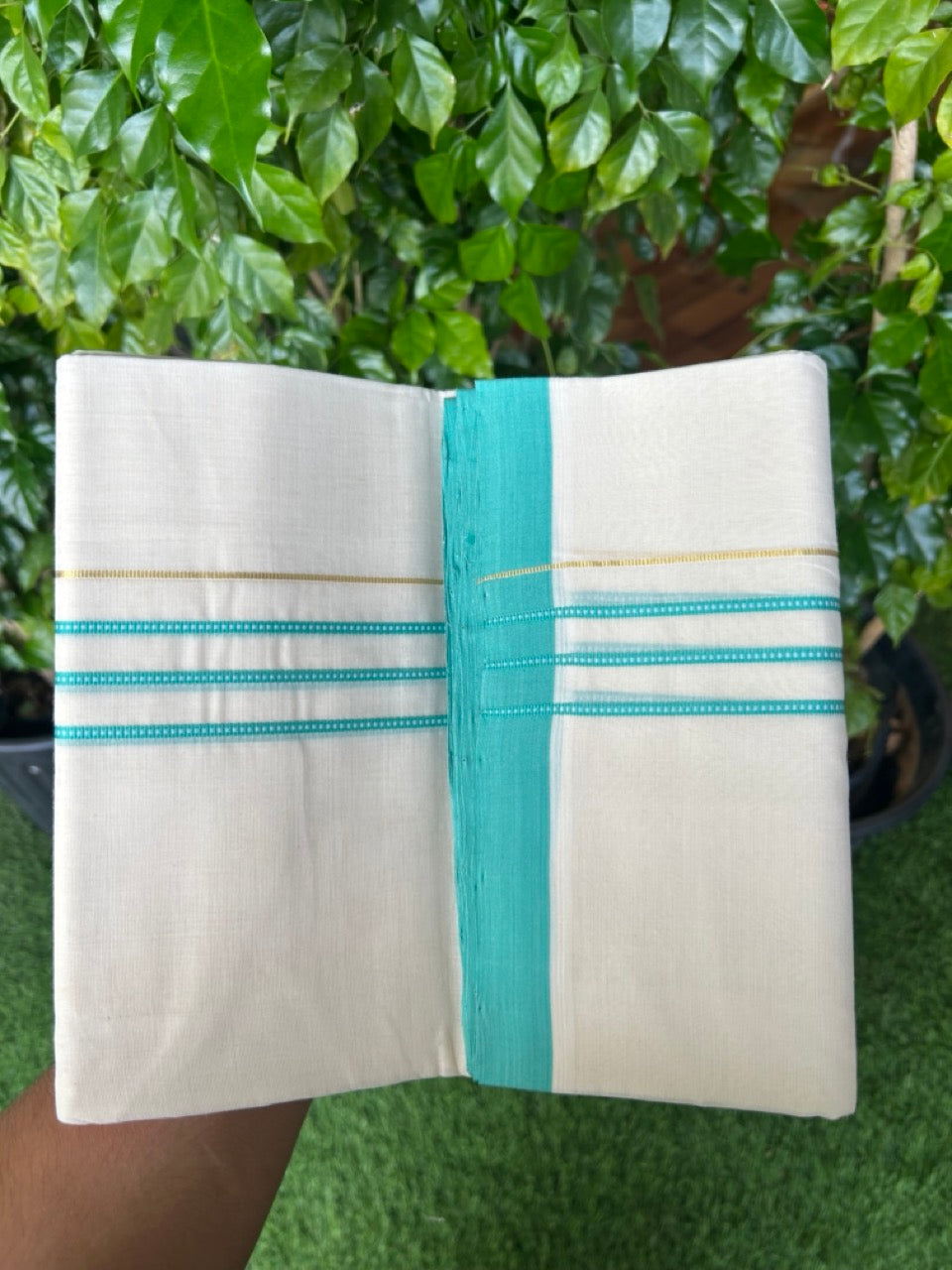 25% DISCOUNT!! KaithariKada HANDLOOM UNAKKUPAAV Balaramapuram - 100% PURE Cotton OFF White - (Unbleached) Double Mundu/Dothi - 80x100 - PURE JERRY 1.25 inch Turquoise blue stripes pattern kara 3.80 meter (8.5 Muzham) - 20KK5209 REA