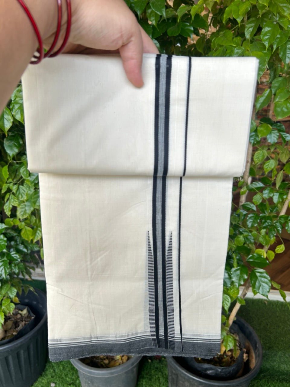 25% DISCOUNT!! KaithariKada HANDLOOM UNAKKUPAAV Balaramapuram - 100% PURE Cotton OFF White - (Unbleached) Double Mundu/Dothi - 80X100 - 1.25 inch Puliyilakkara Black striped chutty Kara 3.80 meter (8.5 Muzham) - 15KK5209 REA