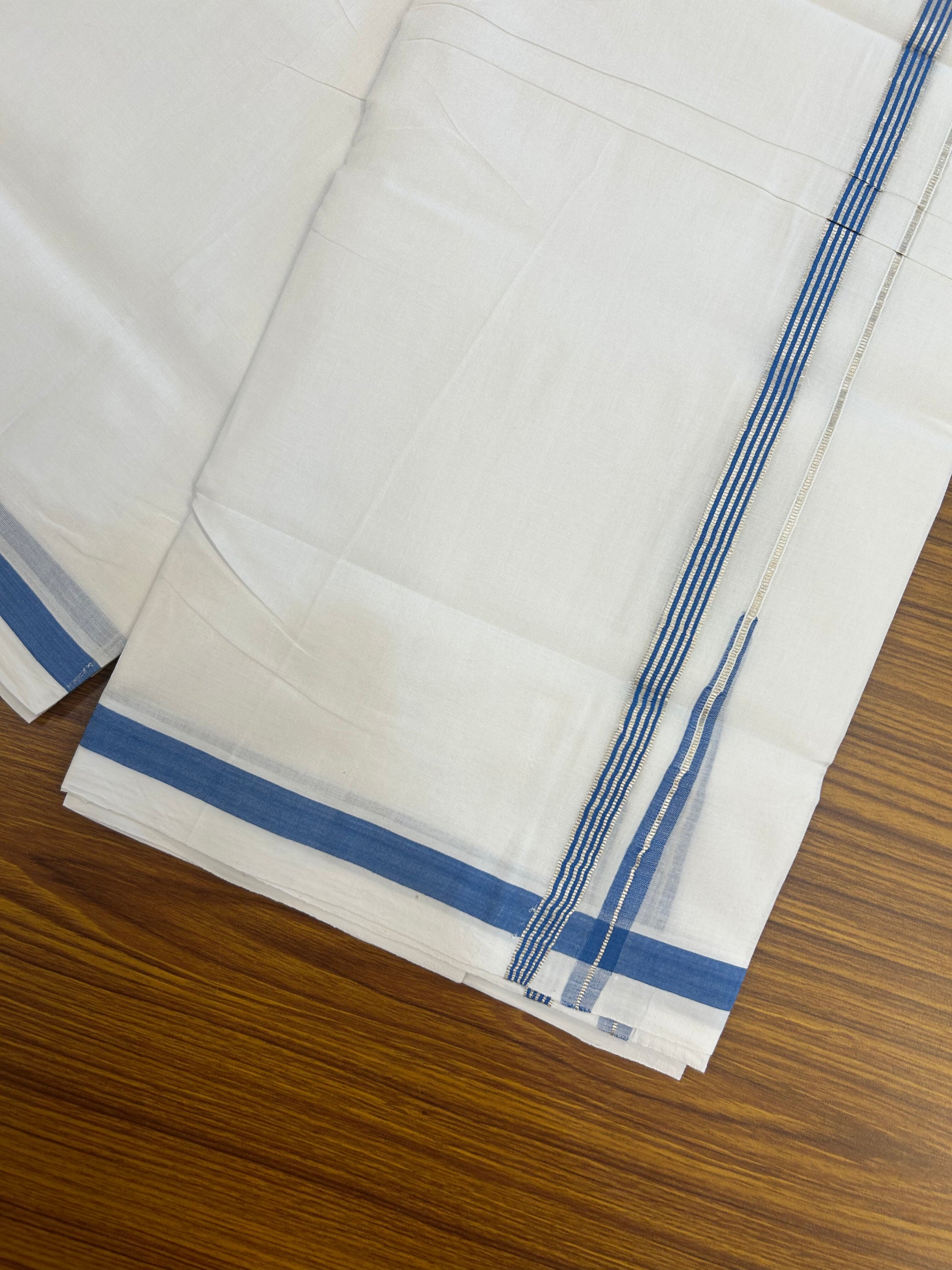 25% Discount ! KaithariKada Handloom Unakkupaav - Kerala Handloom - 100% Pure Cotton Double Mundu/Dhoti Pure white - 80x90 - 1.5 cm Silver Kasav & Blue Stripes Chutty Kara 3.80 mtr (8 Muzham) - 34 KK5369 YAR