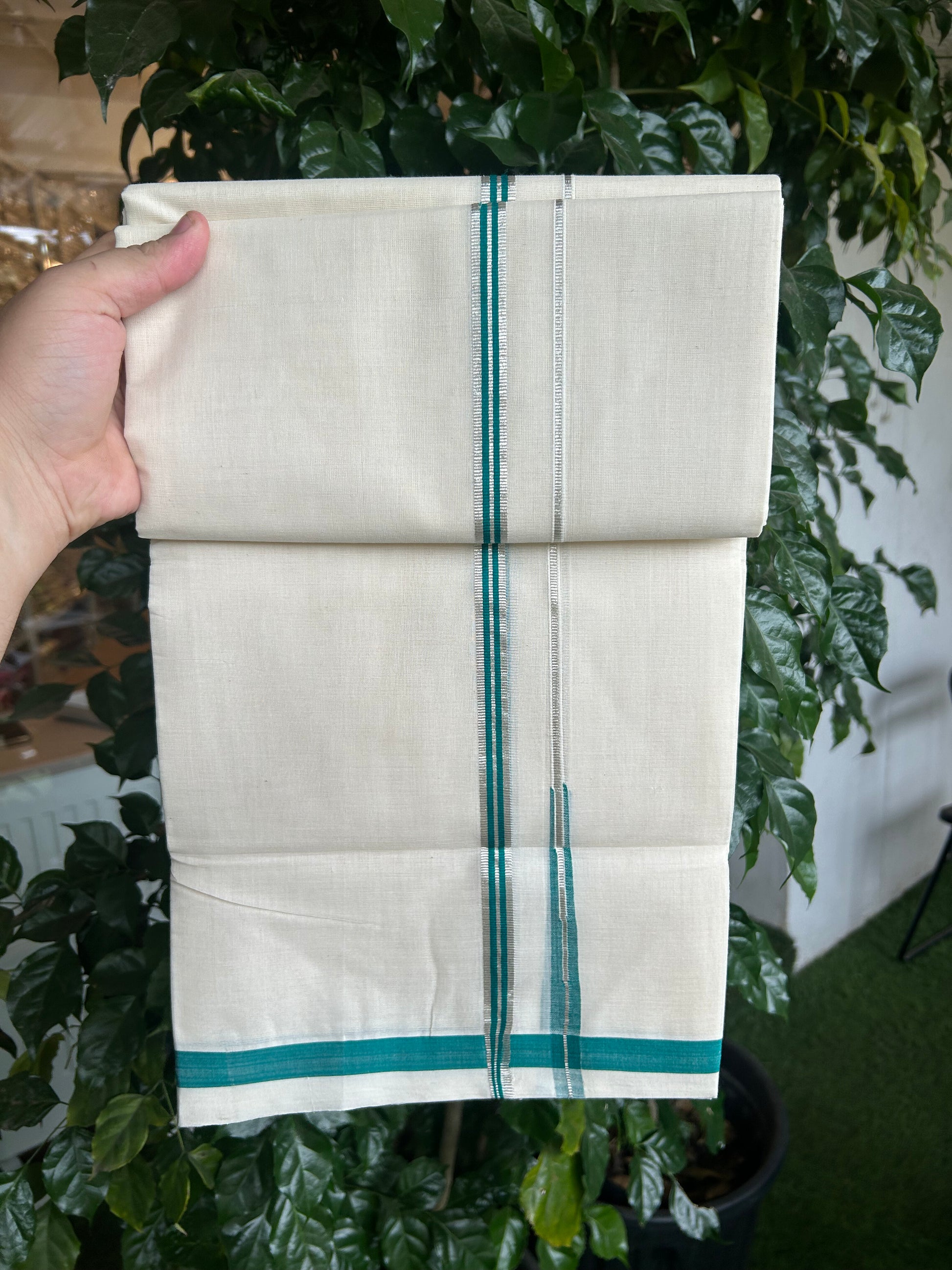 25% Discount!! KaithariKada Handloom Unakkupaav - Kerala Handloom - 100% Pure Cotton Off White - (Unbleached) Double Mundu/Dothi - 80X90 - 0.5 inch Puliyilakkara Silver Kasav & Green Blue Striped Chutty Kara 3.90 mtr (8 muzham) - 16 KK5369 YAR