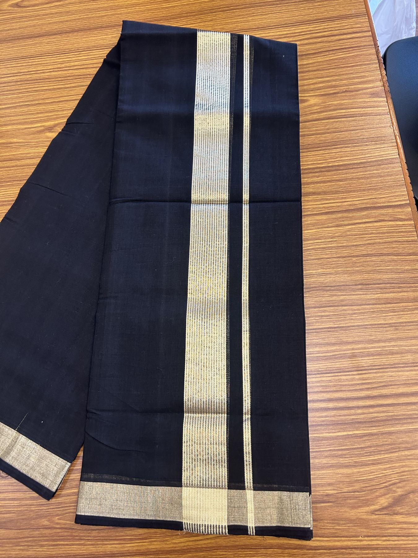 25% Discount! KaithariKada Handloom Unakkupaav - Kerala Handloom - Pure Cotton Double Mundu/Dhoti (Unbleached) - 100x80 - Black Colour Body - 2 inch Light Gold Kasavu Striped Kara - 4 mtr (8.5 Muzham) - 2 KK5342 ABH