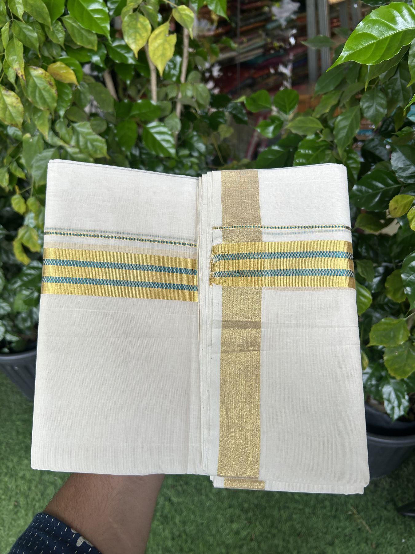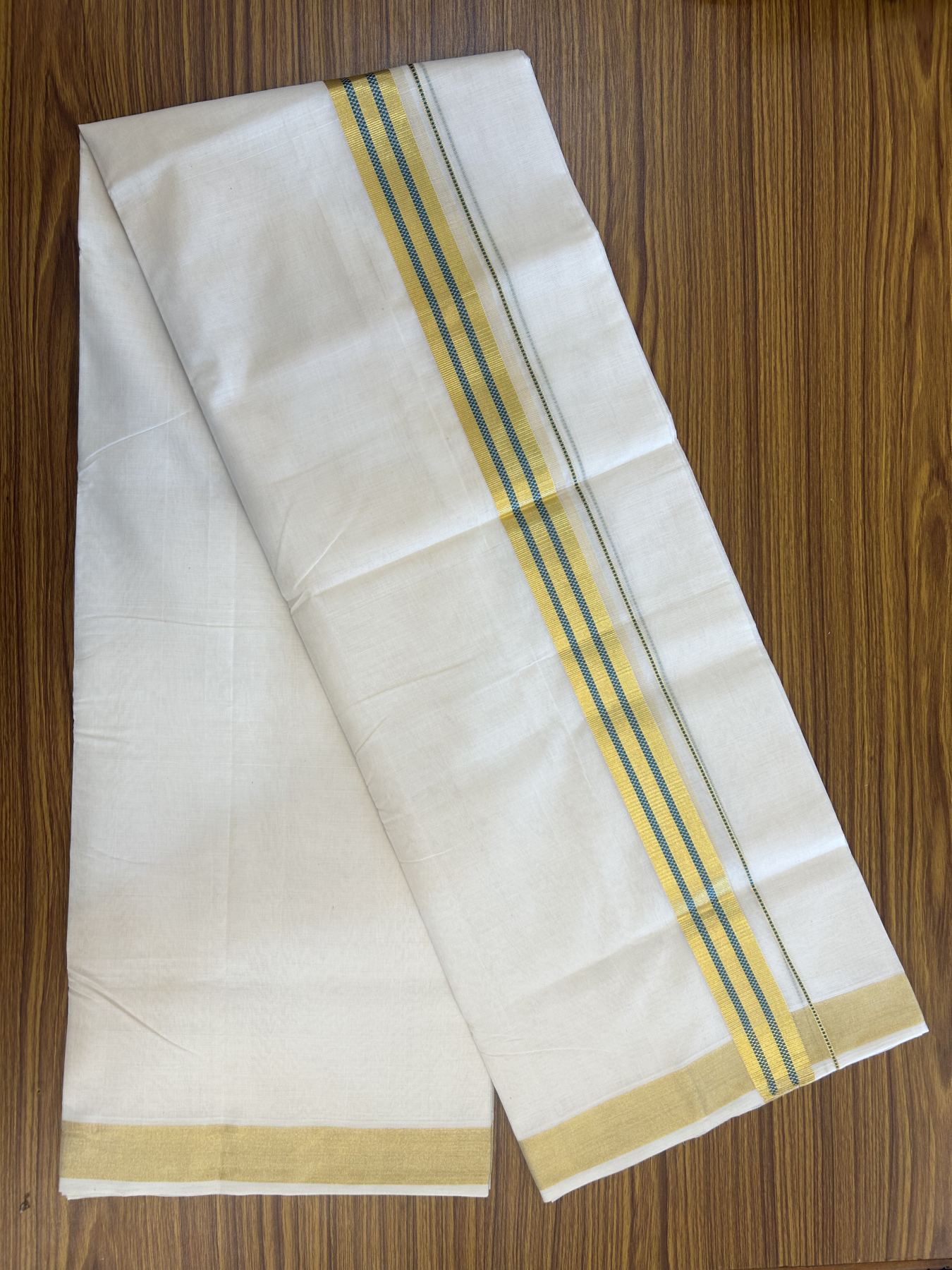 25% Discount ! KaithariKada Handloom Unakkupaav Kerala Handloom - Pure Cotton Off White - (Unbleached) Double Mundu/Dhoti - (100X80) - 1.5 inch Gold Kasav & Peacock Blue Jacquard Design Kara - 4 mtr (8.5 Muzham)- 15 KK5342 ABH
