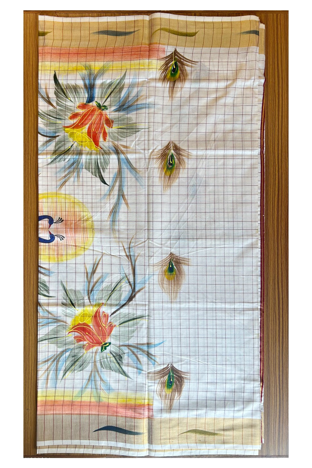 29% Discount!! Kaitharikada Kerala Cotton 2.75 inch Kasavu Maroon Stripes & Hand Painted Peacock Design Saree - 13KK1003HAR