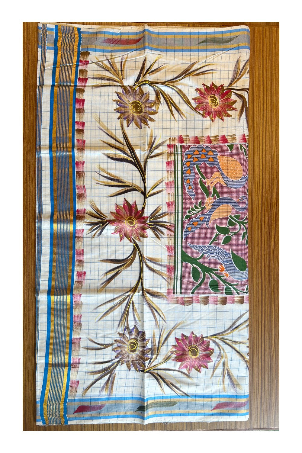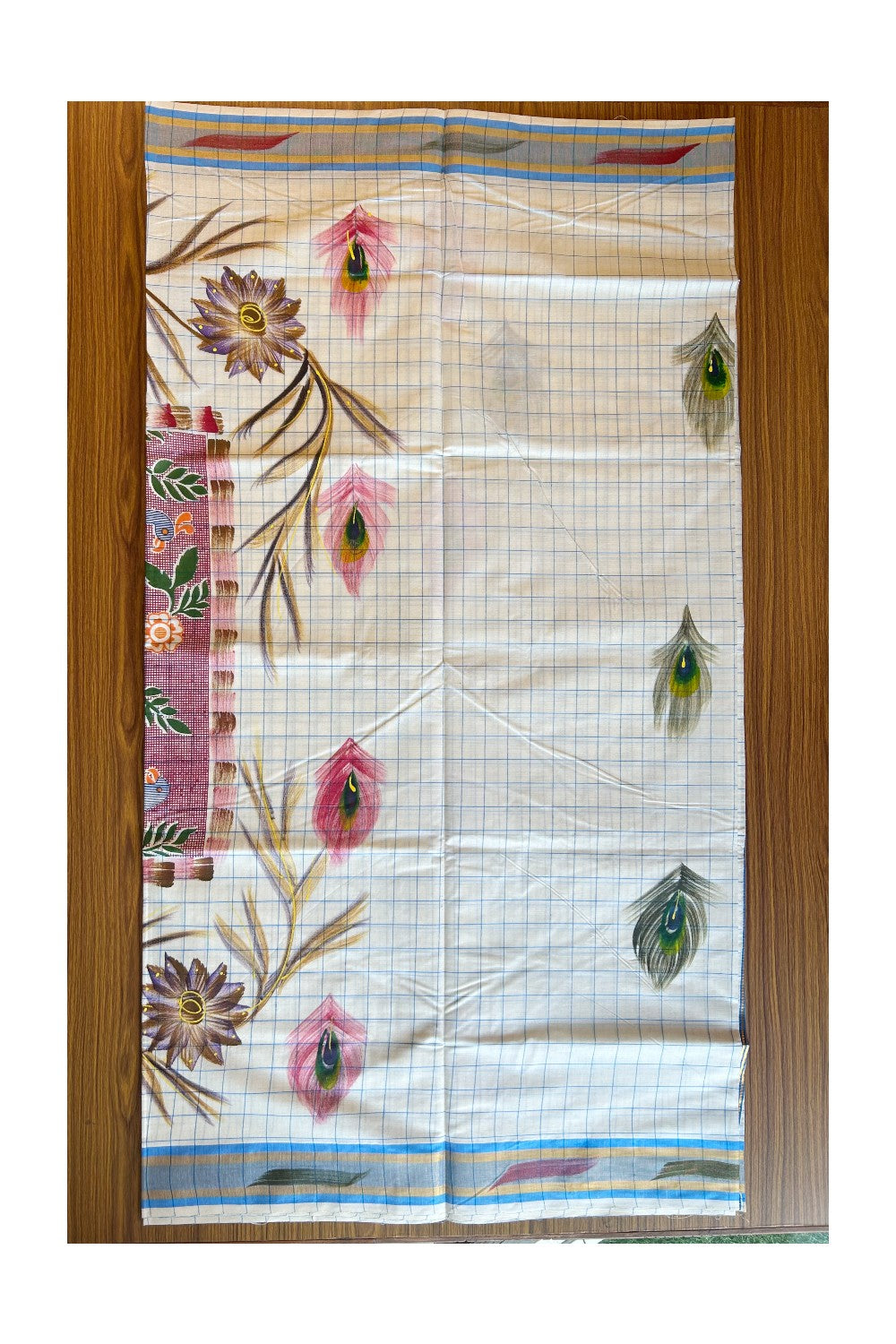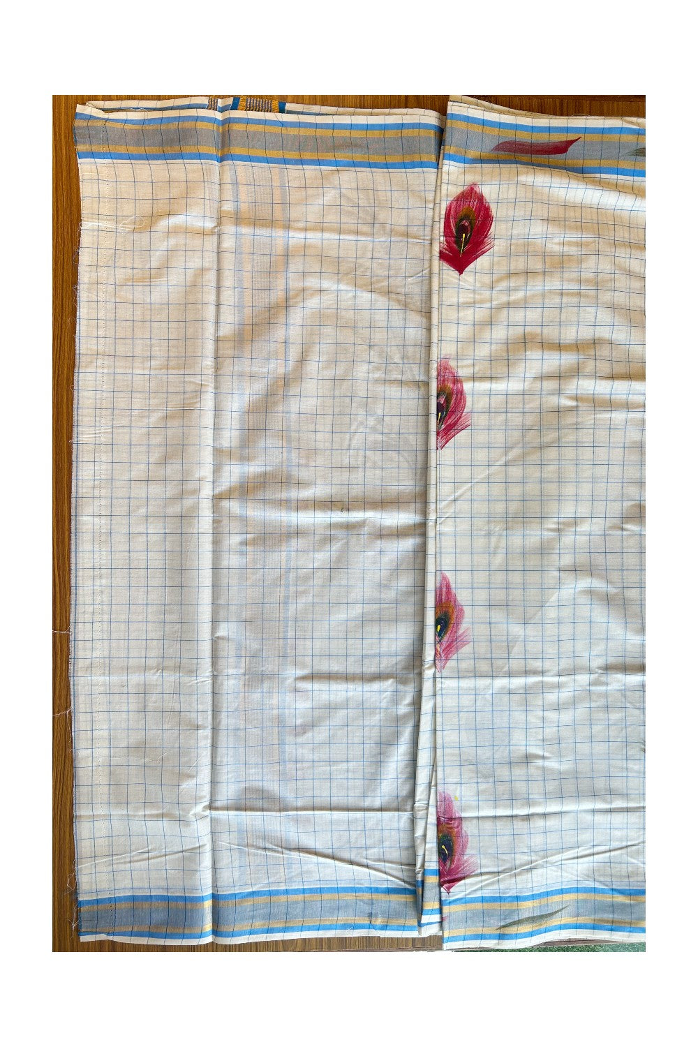 29% Discount!! Kaitharikada Kerala Cotton 2.75 inch Kasavu Blue Stripes & Hand Painted Peacock Design Saree - 14KK1003HAR