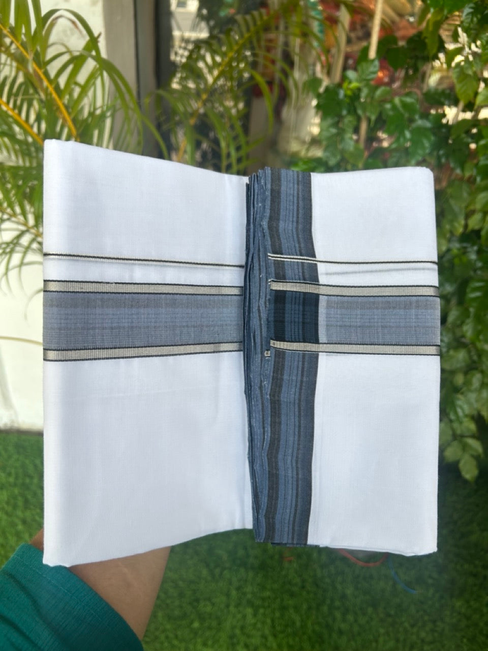25% Discount! NEW ULTRA PURE WHITE HANDLOOM Balaramapuram - 100% Mercerised Cotton Double Mundu/Dhoti - 120(Twisted) x 80 - 1.75 inch Silver Kasavu Blue & Black shaded stripes Kara - 37KK5167REA