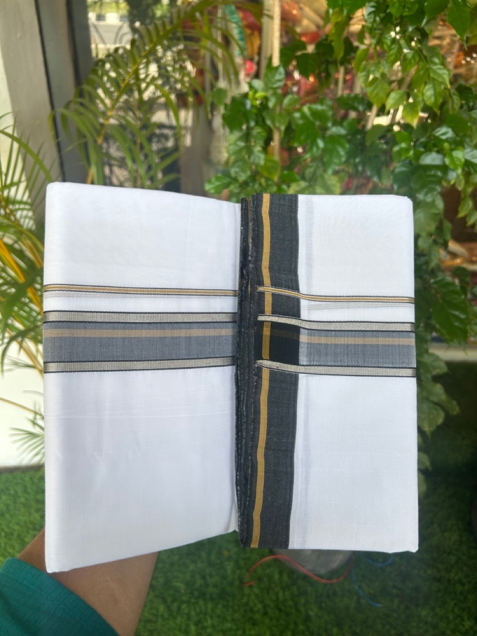 25% Discount! NEW ULTRA PURE WHITE HANDLOOM Balaramapuram - 100% Mercerised Cotton Double Mundu/Dhoti - 120(Twisted) x 80 - 1.5 inch Silver Kasavu Black shaded & Mustard Yellow stripes Kara - 38KK5167REA