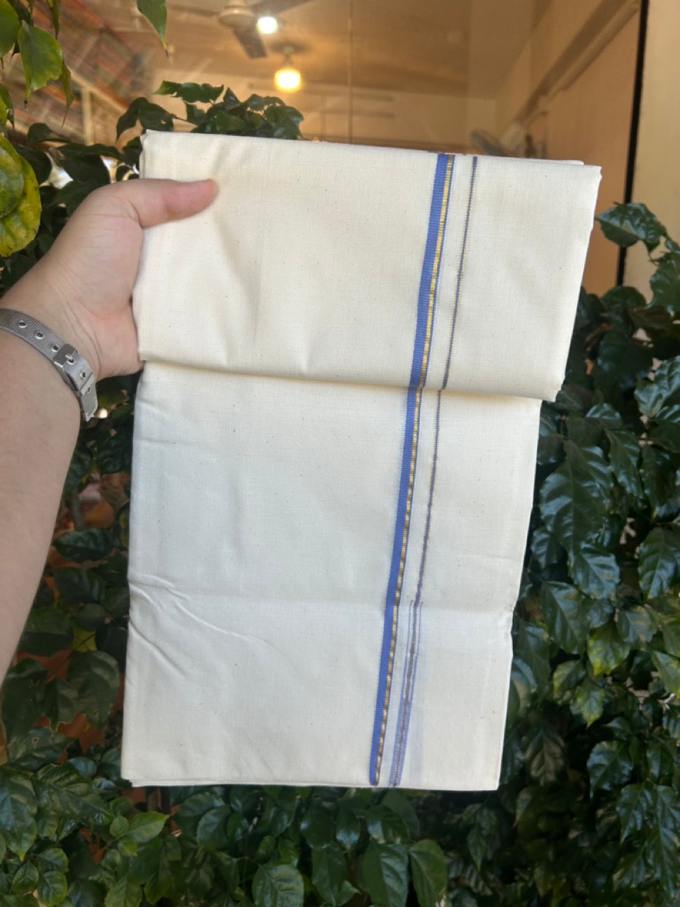 25% DISCOUNT!! SIGNATURE KAITHARIKADA EXCLUSIVE SINGLE DHOTI - 100% Cotton Balaramapuram HANDLOOM Single Mundu/Dhoti - Off White (Unbleached) 0.25 inch Puliyilakkara Gold Kasav & Lavender Blue Chutty Kara (2 meter / 4 muzham) - 4 KK5293 KAI