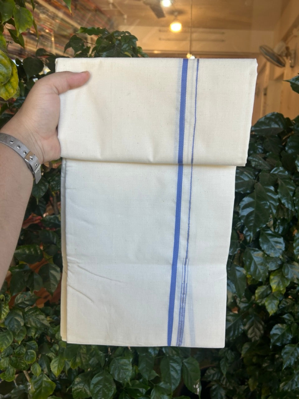 25% DISCOUNT!! SIGNATURE KAITHARIKADA EXCLUSIVE SINGLE DHOTI - 100% Cotton Balaramapuram HANDLOOM Single Mundu/Dhoti - Off White (Unbleached) 0.25 inch Puliyilakkara Silver Kasav & Lavender Blue Chutty Kara (2 meter / 4 muzham) - 6 KK5293 KAI