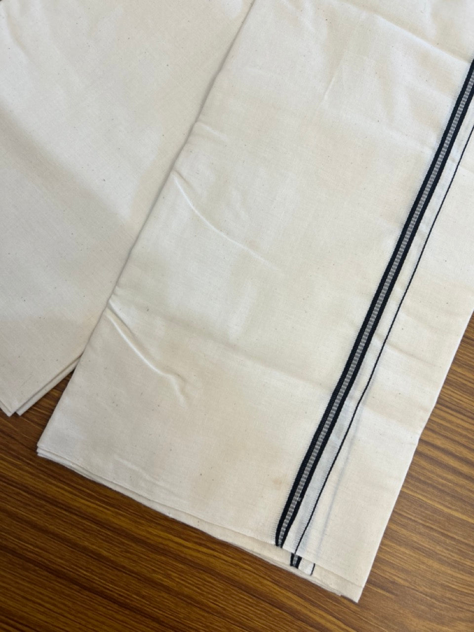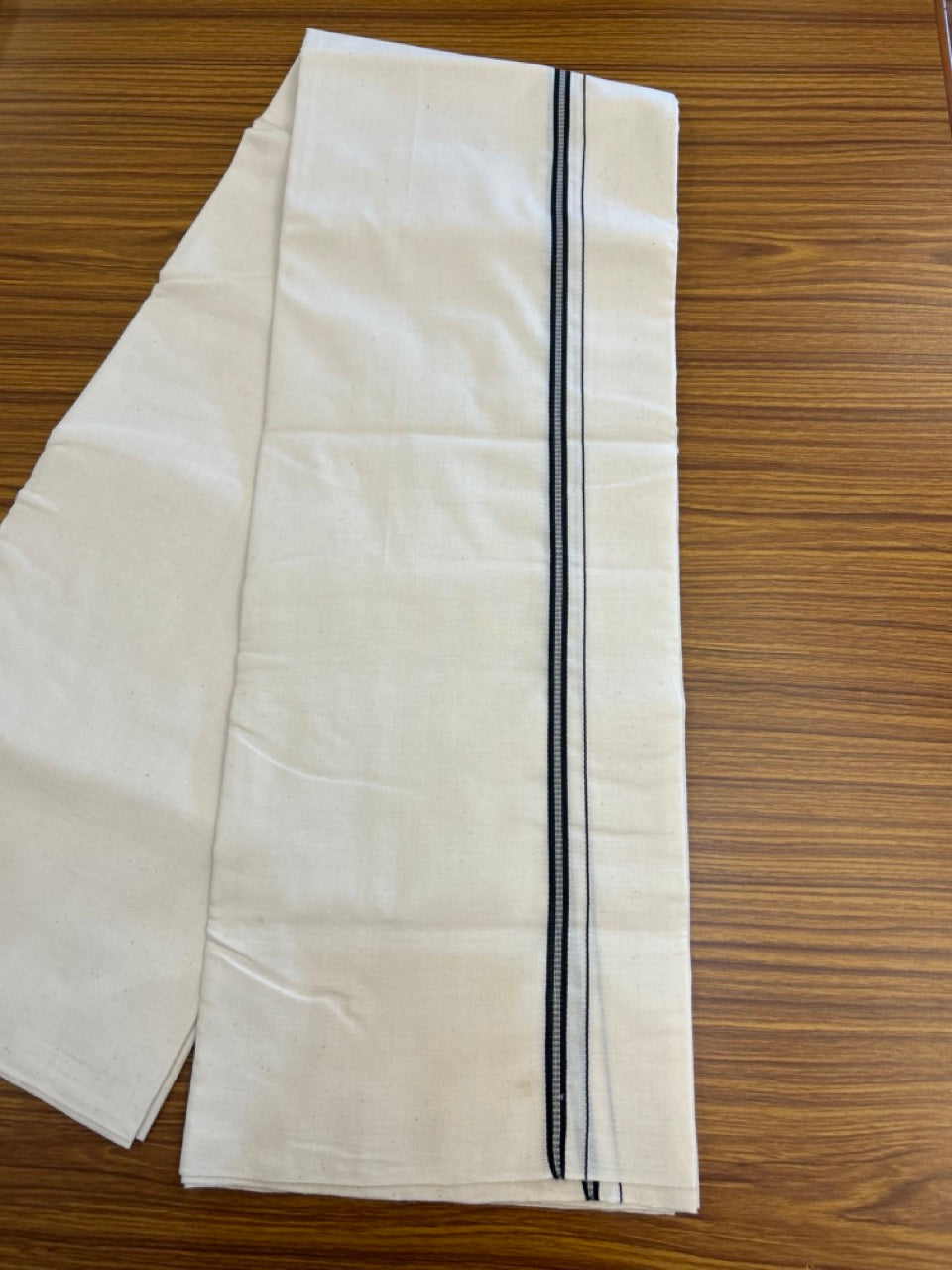 25% Discount!! Signature Kaitharikada Exclusive Single Dhoti - 100% Cotton Balaramapuram Handloom Single Mundu/Dhoti - Off White (Unbleached)- 1 cm Black Striped Kara (2 meter / 4 muzham) - 10 KK5304KAI