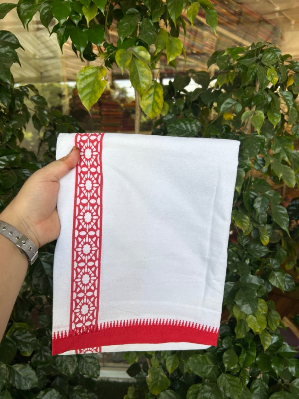 Kaitharikada - Polyster + Cotton - 20s twisted - Pure white Single Kaily / Lungi - 1.5 inch Red Printed Kuppadam Border with White colour body (2 meter / 4 muzham) - 6 KK8035 GAN