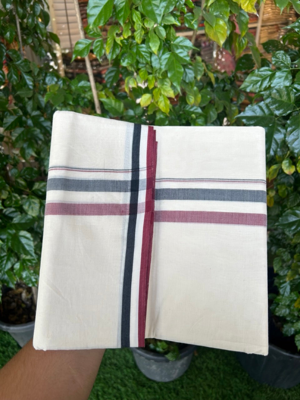 ADMK VESHTI - 20% Discount ! KaithariKada 100% Cotton off white Double - (Unbleached) Mundu/Dhoti - 100X100 - 1.75 inch Black White & Maroon Shaded kara - 23 KK5257 ASH