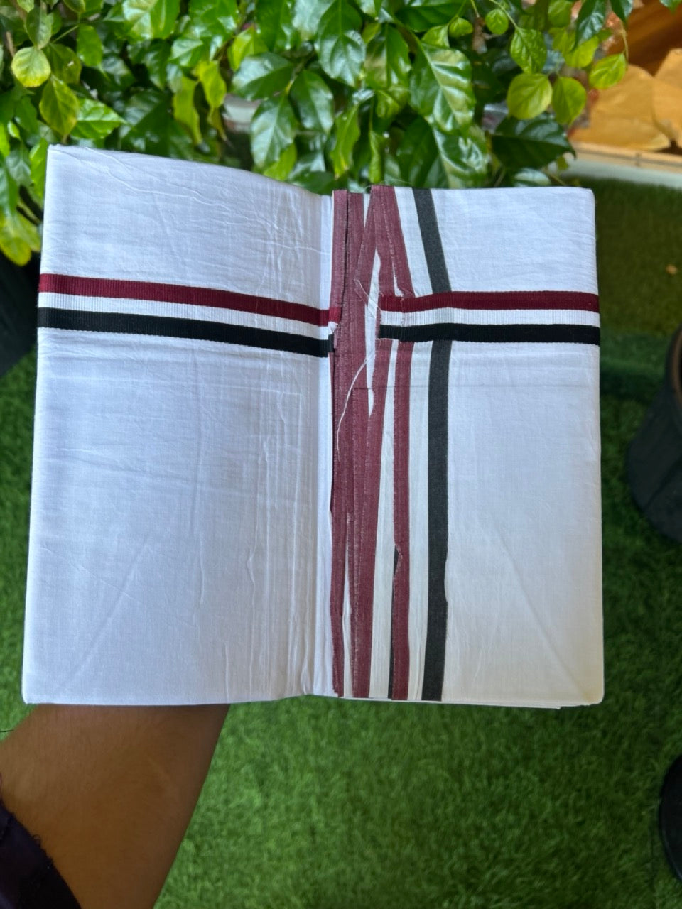 ADMK VESHTI - 20% DISCOUNT! KaithariKada 100% Cotton PURE WHITE Double Mundu/Dhoti - 100X100 - 1 inch Black White & Maroon kara 4 mtr (8.5 muzham) - 38KK5224 ASH