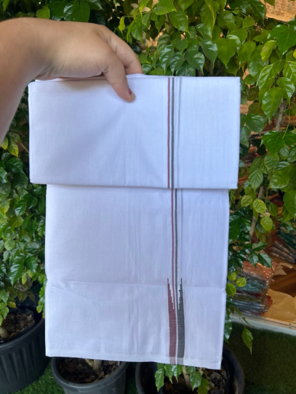 ADMK VESTHI 20% DISCOUNT ! KaithariKada Balaramapuram 100% COTTON DOUBLE PURE WHITE Mundu/Dhoti-100X100- 0.75 Inch Puliyilakkara Maroon & Black Shaded Chutty Kara 3.75 mtr (8 muzham) - 43KK5224 ASH