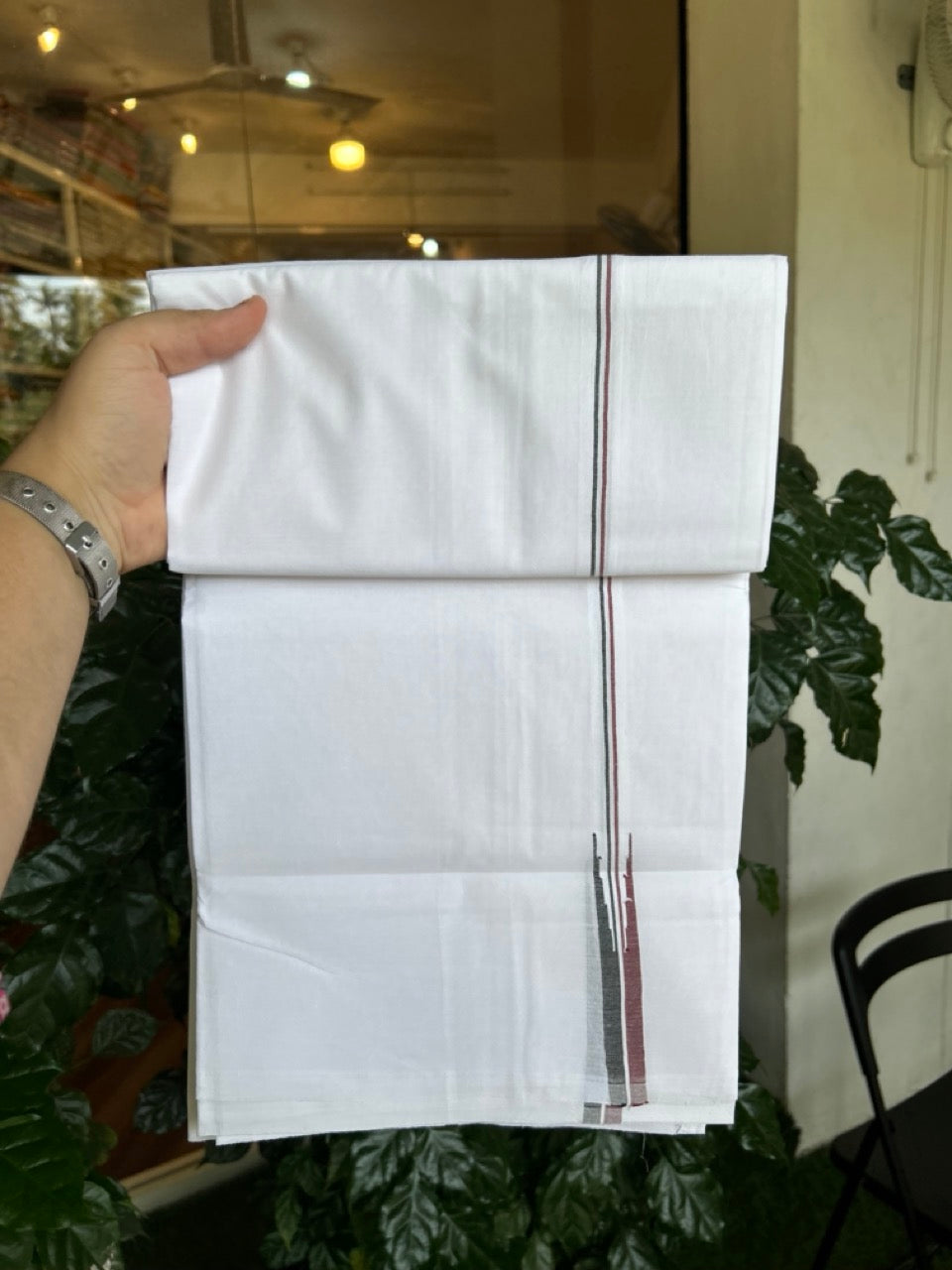 ADMK VESTHI 20% DISCOUNT ! KaithariKada Balaramapuram 100% Cotton Pure White Double Mundu/Dhoti- 100X100- 0.5 Inch Puliyilakkara Maroon & Black Chutty Kara - 16 KK5297 ASH