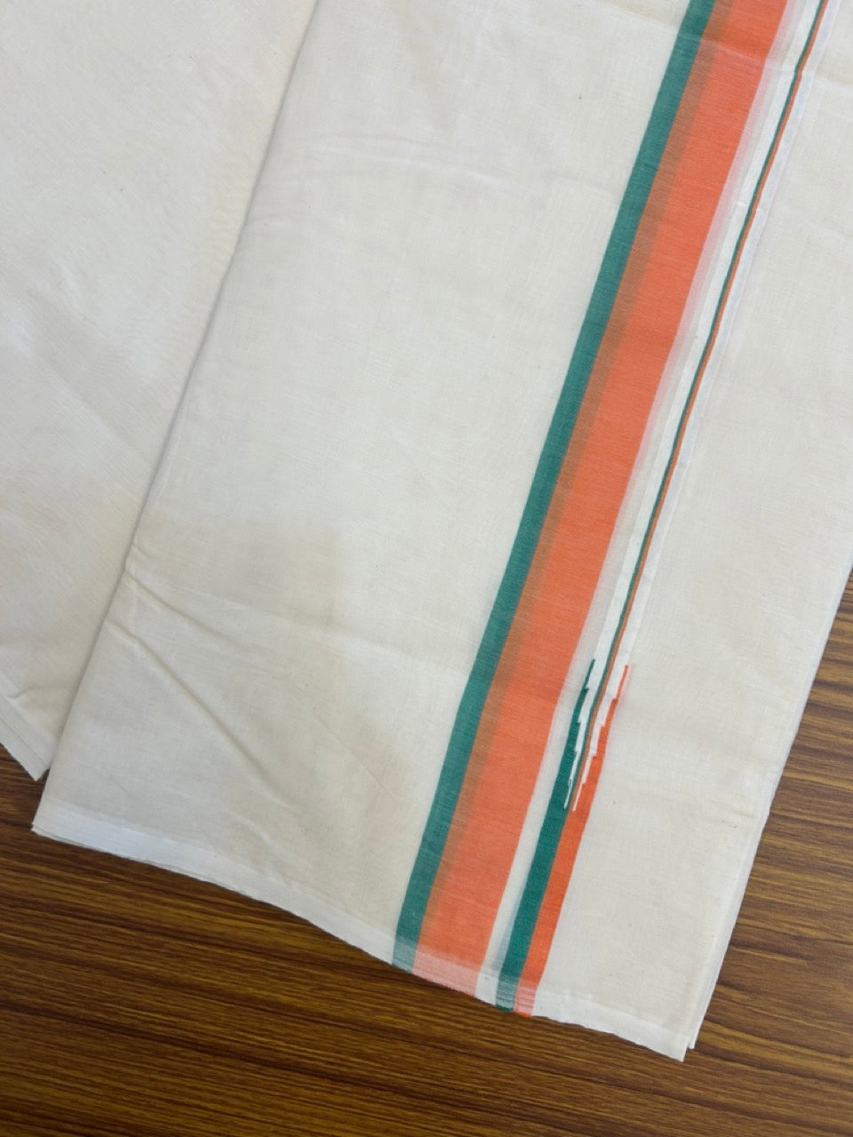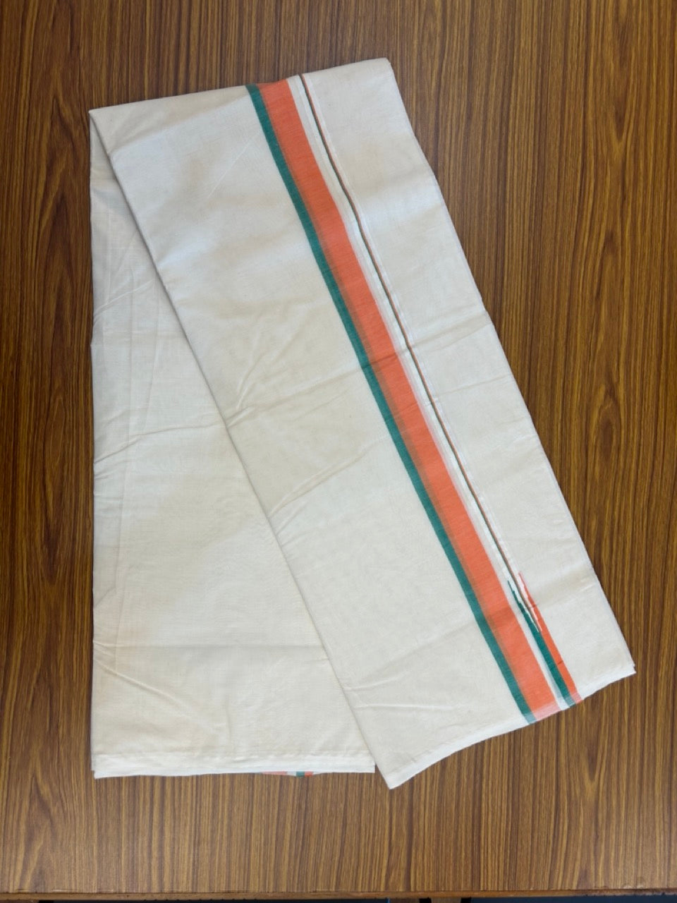 BJP VESHTI - 20% DISCOUNT! KaithariKada 100% Cotton off white Double - (Unbleached) Mundu/Dhoti - 100X100 - 1.25 inch Puliyilakkara Orange & Green Shaded Chutty Kara - 18 KK5257 ASH