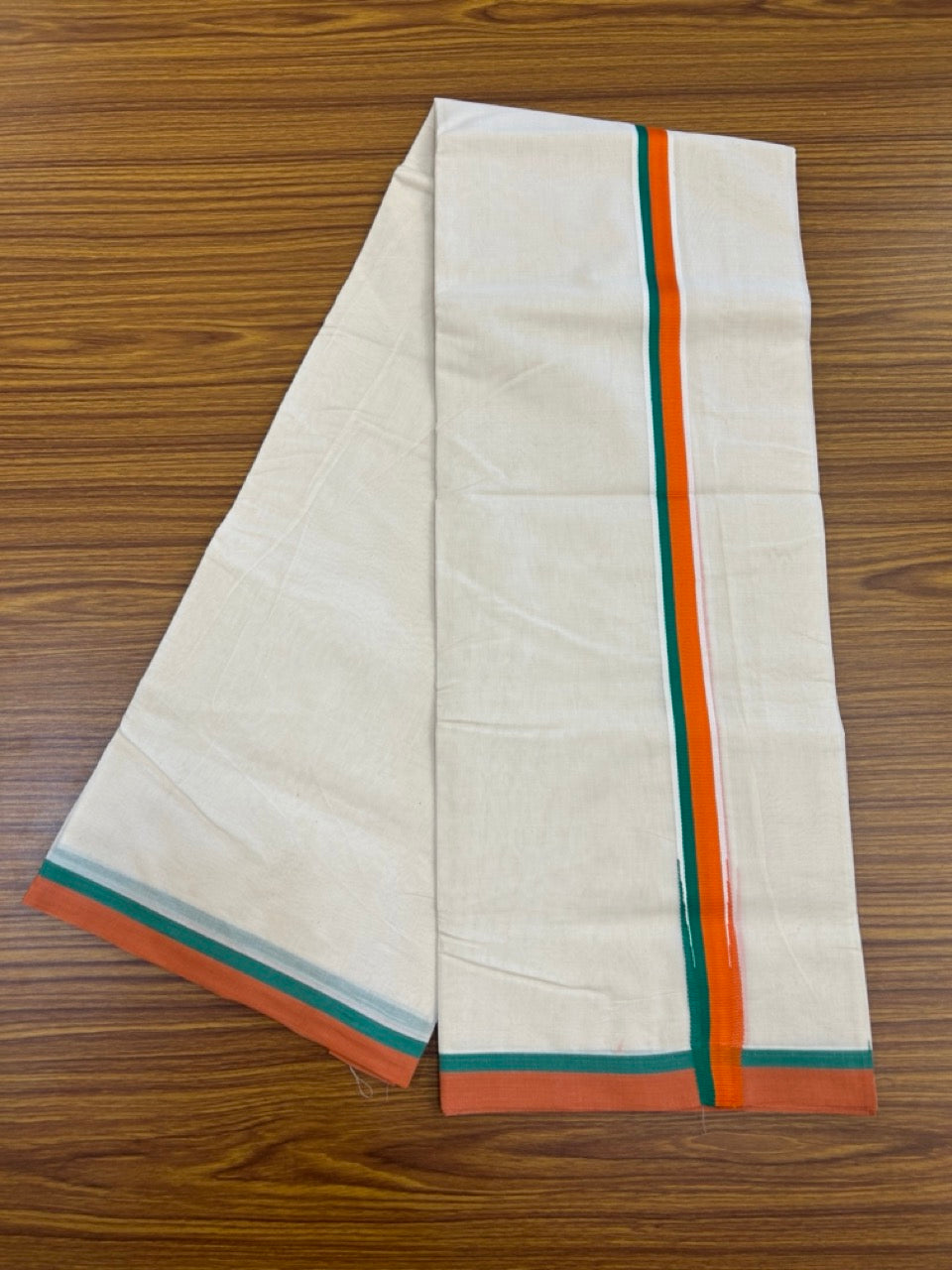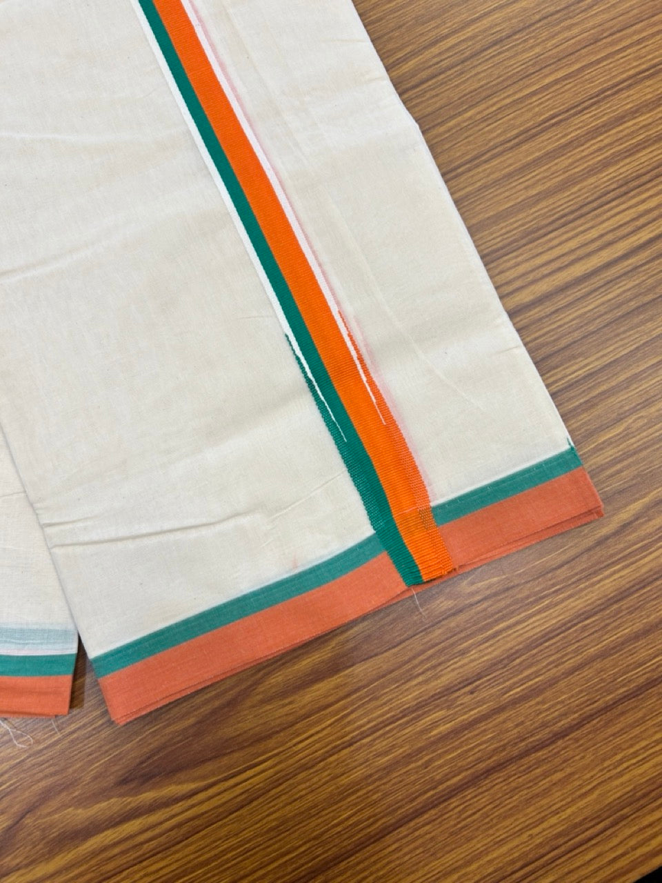 Bjp Veshti - 20% Discount! Kaitharikada 100% Cotton Off White Double - (Unbleached) Mund/Dhoti - 100X80 - 1.25 inch Puliyilakkara Orange & Green Chutty Kara 4mtr (8.5 muzham) - 20 KK5268 ASH