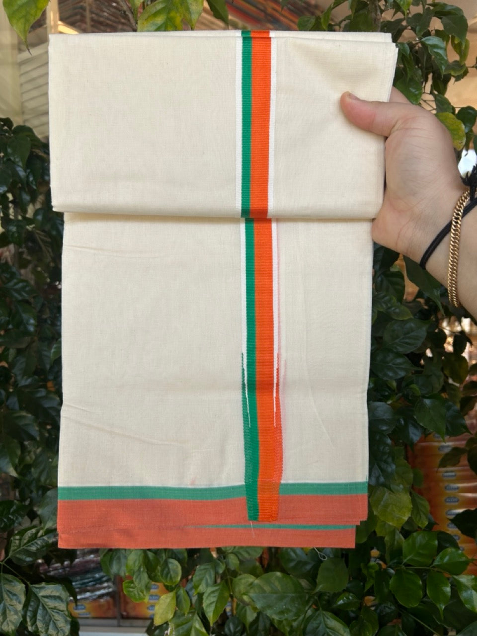 Bjp Veshti - 20% Discount! KaithariKada 100% Cotton Off White Double - (Unbleached) Mund/Dhoti - 100X80 - 1.25 inch Puliyilakkara Orange & Green Chutty Kara 4mtr (8.5 muzham) - 20 KK5268 ASH