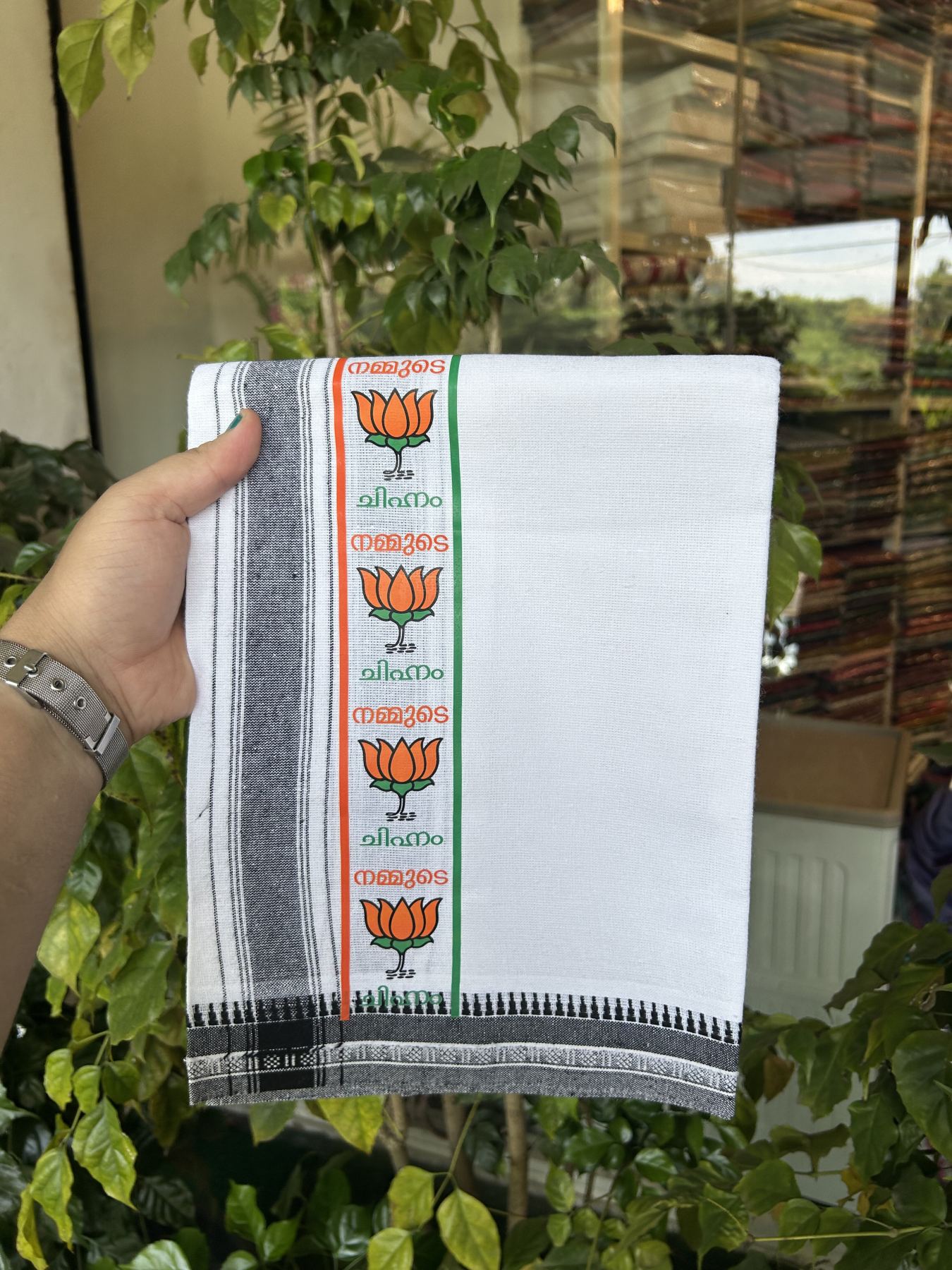 Bjp Veshti - Kaitharikada - Single Kaily / Lungi - Polyster + Cotton - 20s twisted - 3.75 inch Black striped Bjp Lotus Printed Kuppadam Border with White colour body (2 meter / 4 muzham) - 3 KK8045 GAN