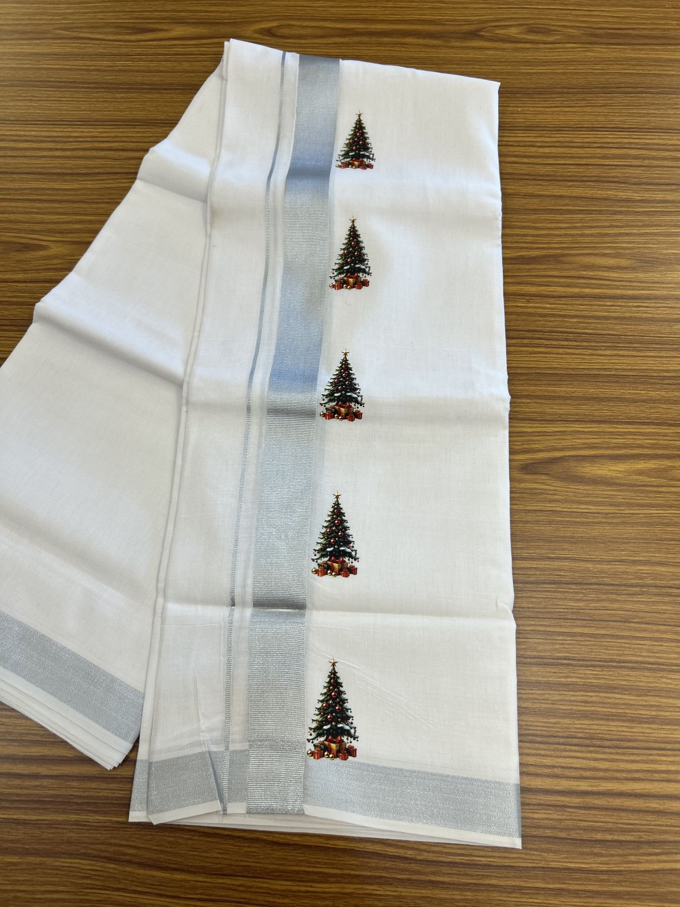 Christmas Special - 35% Discount ! KaithariKada Balaramapuram - Double Pure white Mundu/Dhoti- 60s - 50% Cotton & 50% Polyester - 1.5 inch Silver Kasav Christmas tree Printed Kara - 3.70 mtr (8 muzham) - 66 KK5329 GAN
