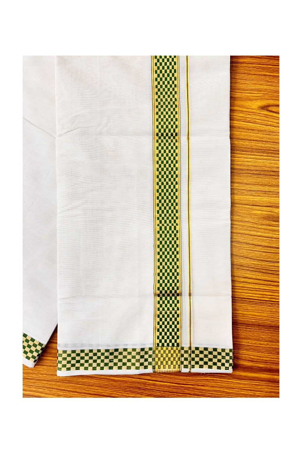 25% Discount ! KaithariKada Handloom Unakkupaav Balaramapuram - 100% Pure Cotton 3.90 Meter Off White (Unbleached) Double Mundu/Dhoti - Green Check & Kasav Design 2.5 Inch Kara 3.90 mtr- ABH24