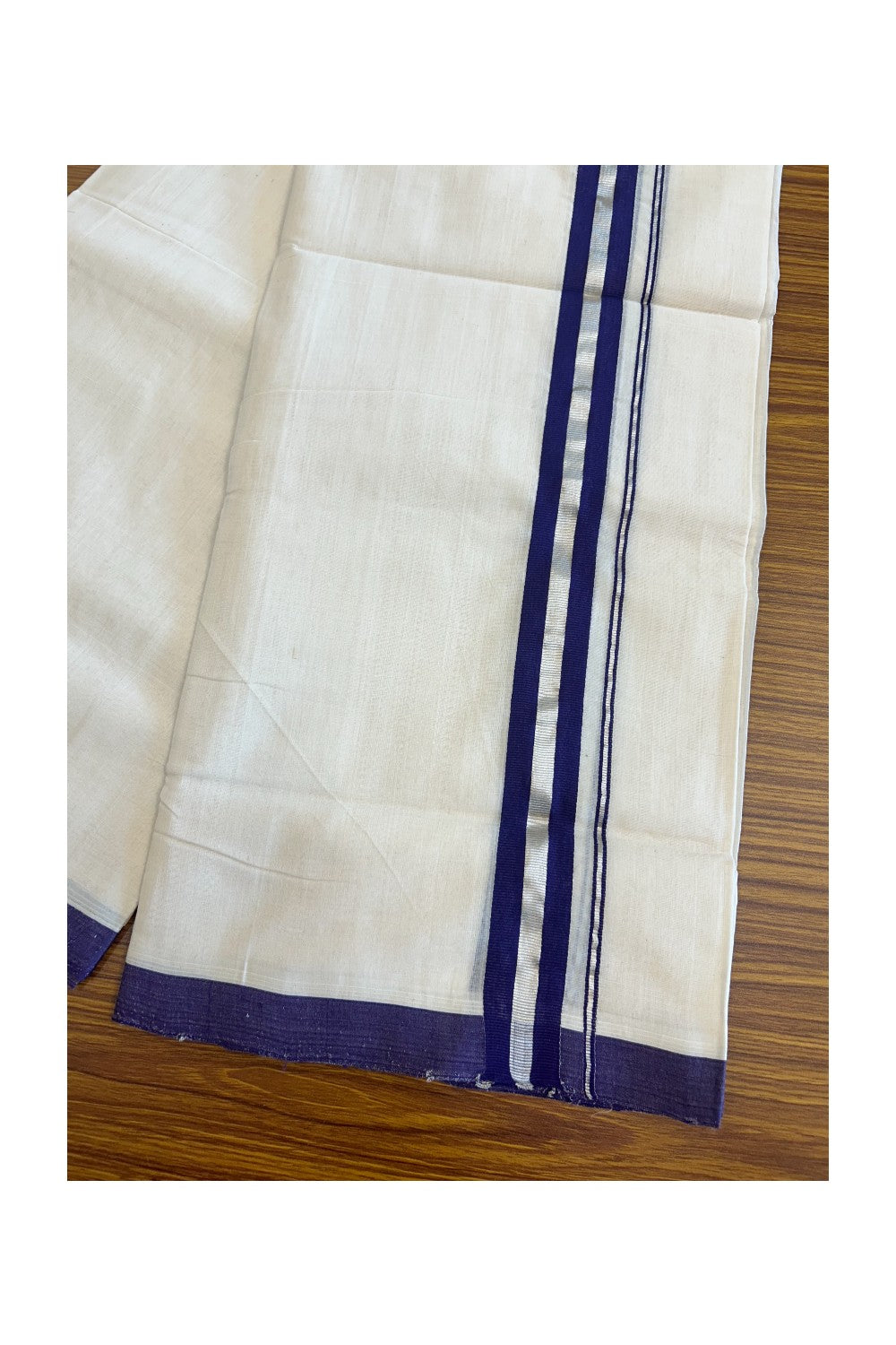 25% Discount! KaithariKada Balaramapuram Handloom Unakkupaav - 100% Pure Cotton off white (Unbleached) Double Mundu/Dhoti - 1.75 inch Silver Kasavu & Violet+Blue Stripes Kara-67