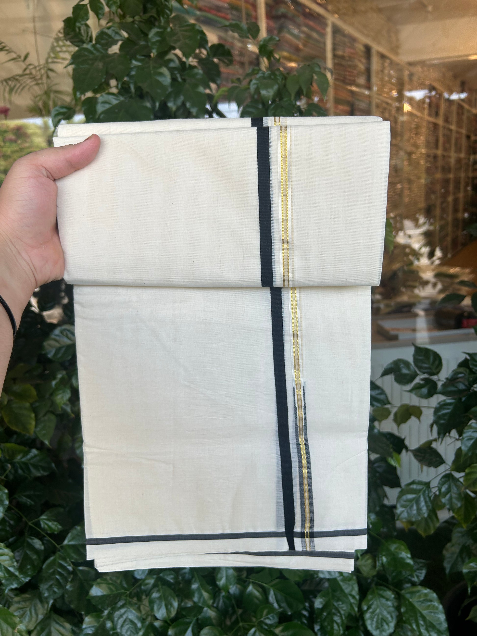 13% Discount!!! KaithariKada Balaramapuram 100% Cotton off white (Unbleached) Double Mundu/Dhoti-100x100 1.cm Chutty Black & Kasavu-28