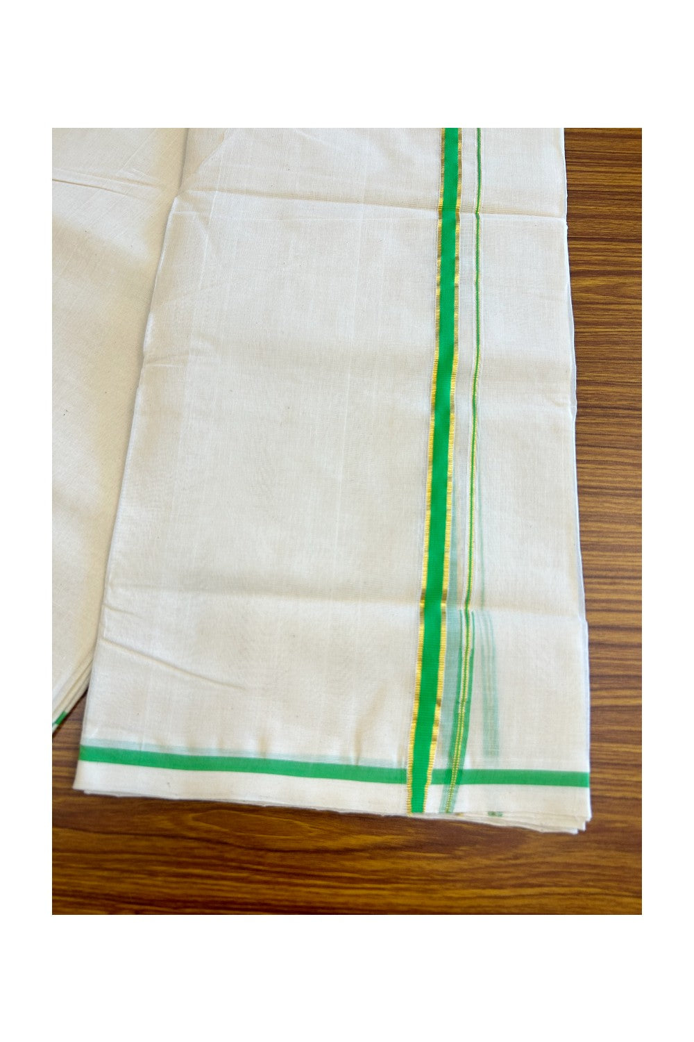 25% Discount! KaithariKada Handloom Millpaav Balaramapuram - 100% Pure Cotton off white (Unbleached) Double Mundu/Dhoti - 1.cm Chutty Puliyilakkara Fluorescent Green & Kasav-129
