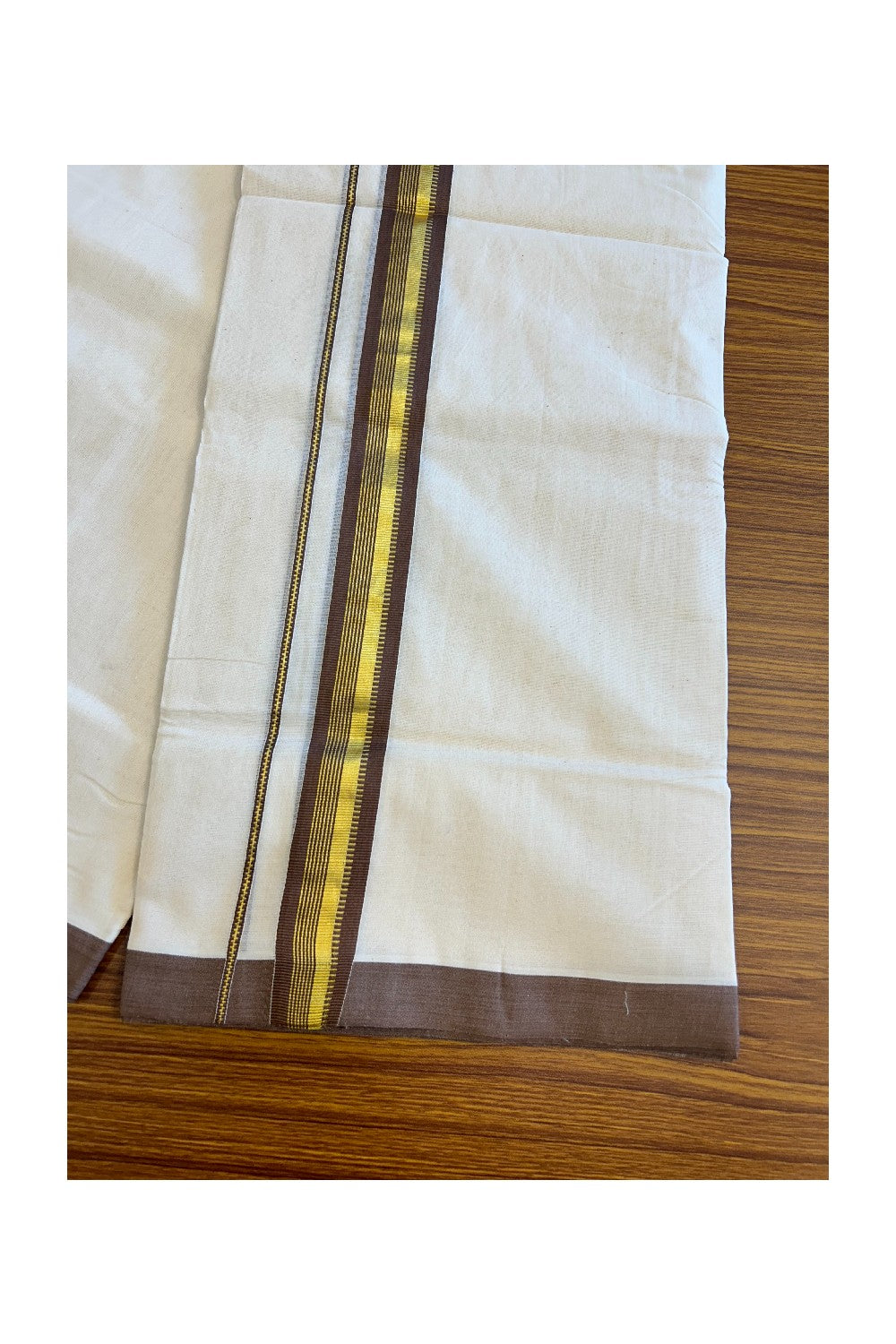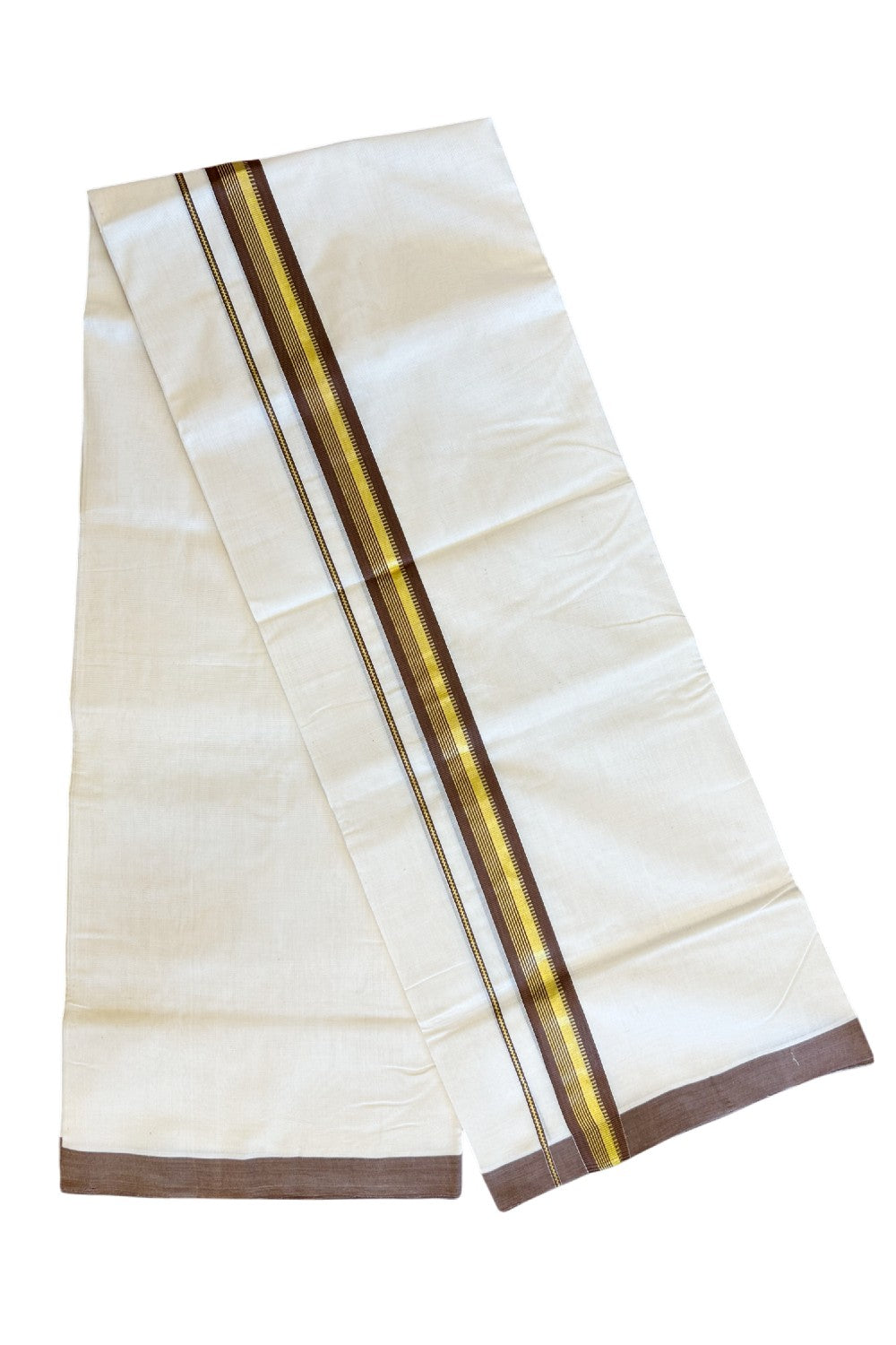 25% Discount KaithariKada Handloom Unakkupaav Balaramapuram - 100% Pure Cotton Off White (Unbleached) Double Mundu/Dhoti - 2.inch Kasav & Brown Pattern Kara-210