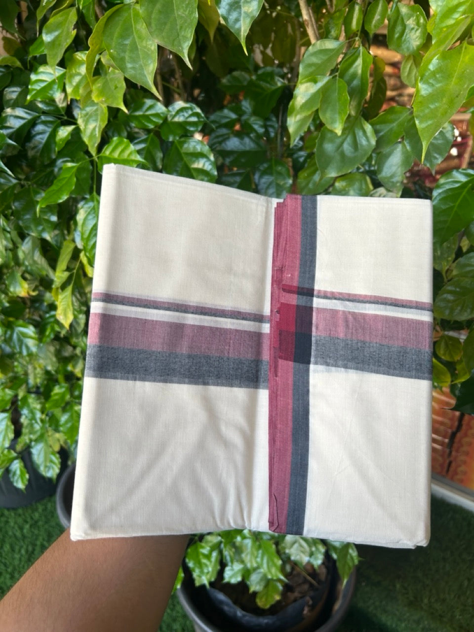 DMK Veshti - 20% DISCOUNT! KaithariKada 100% Cotton off white Double - (Unbleached) Mundu/Dhoti - 100X100 - 1.75 inch Black & Maroon shaded kara - 4 mtr (8.5 muzham)- 1KK5228 ASH
