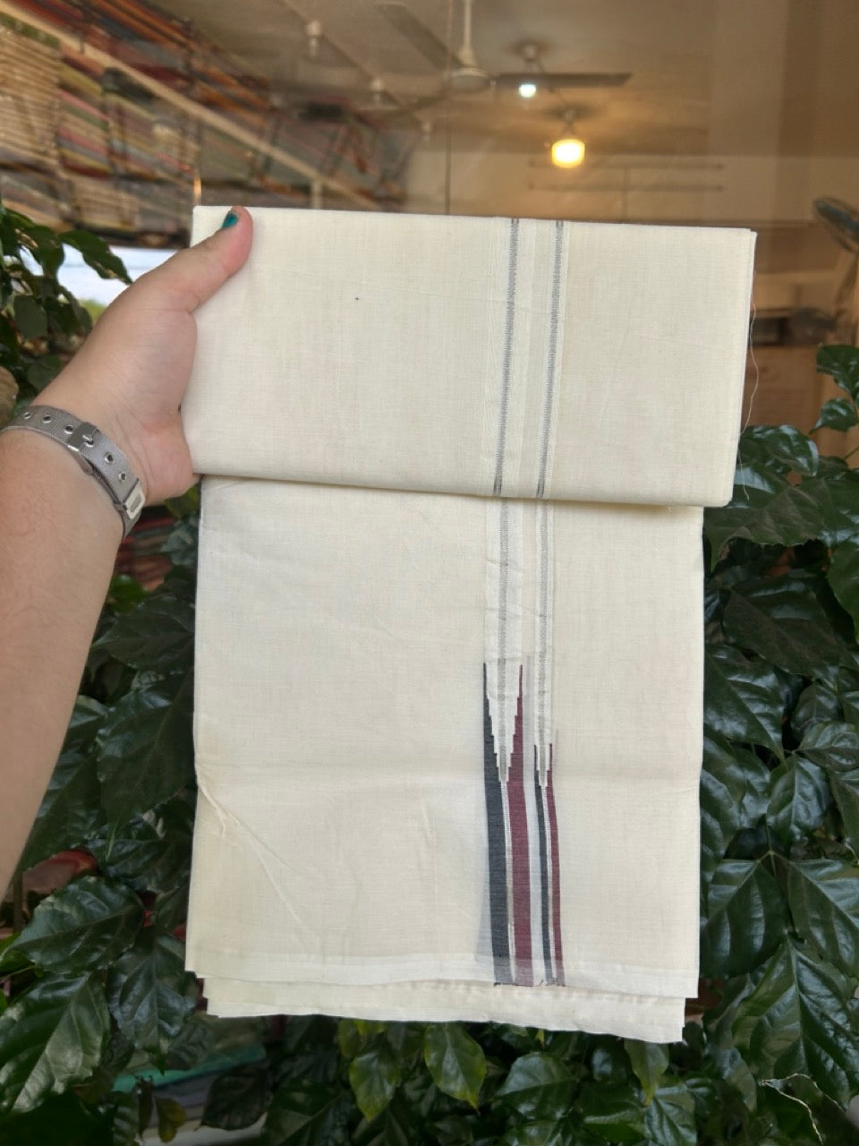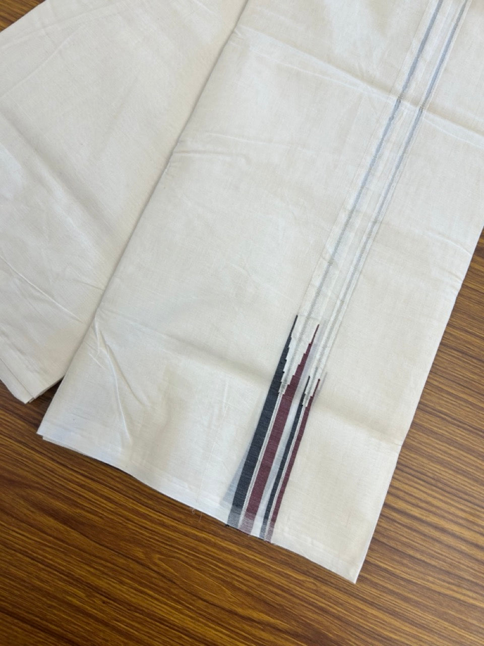 Dmk Veshti - 20% Discount! KaithariKada 100% Cotton off white Double - (Unbleached) Mundu/Dhoti - 100X100 - 0.75 inch Puliyilakkara Silver Kasav Black & Maroon Chutty kara - 6 KK5300 ASH