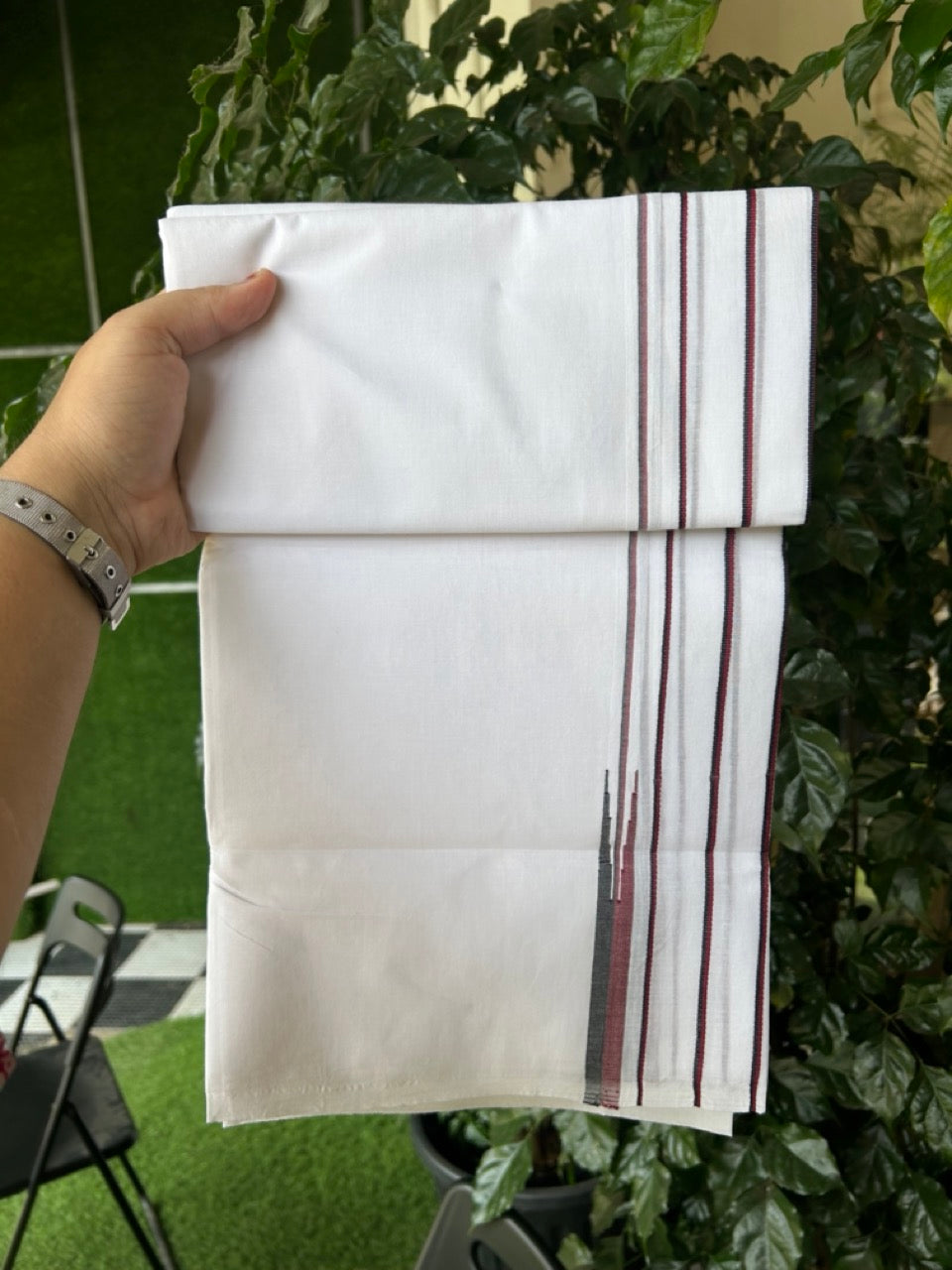 DMK Veshti -20% DISCOUNT! KaithariKada 100% Cotton Pure white Double - (Unbleached) Mundu/Dhoti - 100X100 - 5.75 inch Puliyilakkara Black & Maroon Stiped Chutty kara - 19 KK5297 ASH