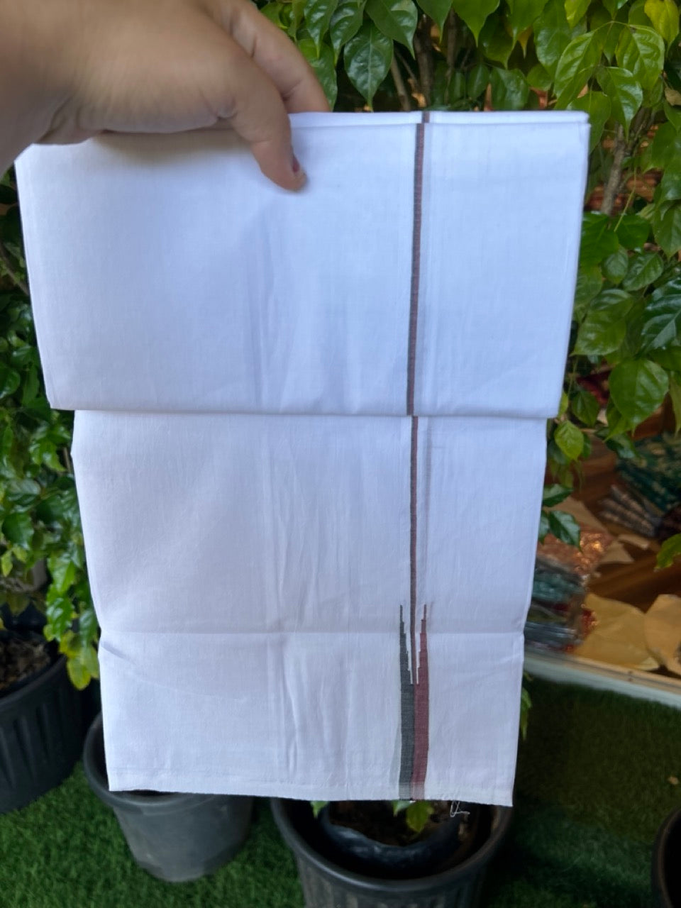 DMK Veshti - 20% Discount !! KaithariKada Balaramapuram PURE WHITE DOUBLE Mundu/Dhoti - 100X100 - Puliyilakkara 0.25 inch Maroon & Black Thin Chutty Kara 3.75 mtr (8 muzham) - 51KK5224 ASH