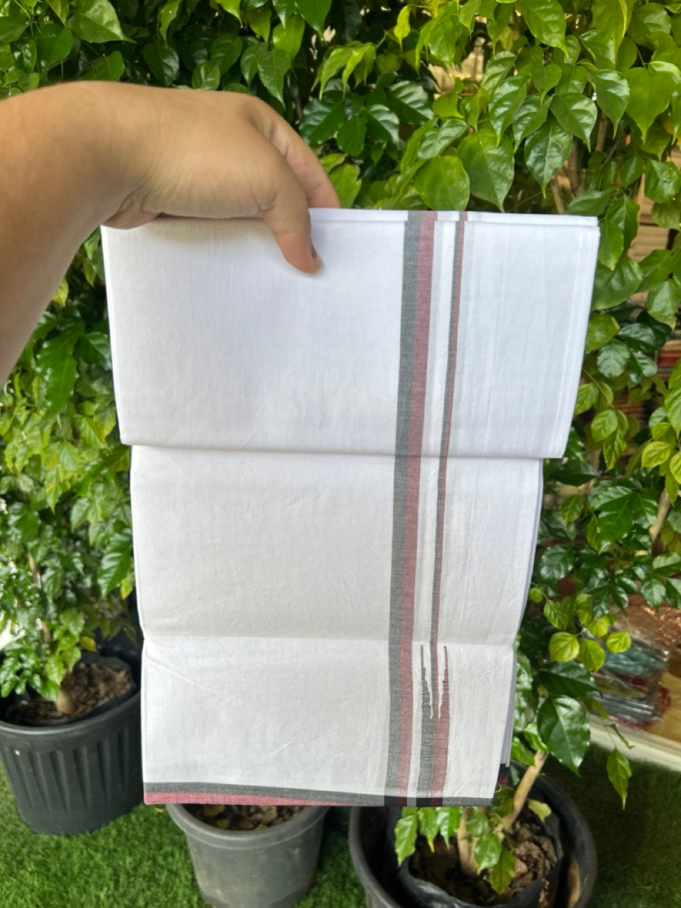 DMK Veshti - 20% Discount !! KaithariKada Balaramapuram PURE WHITE SINGLE Mundu/Dhoti - 100X100 - Puliyilakkara 0.5 inch Maroon & Black Thin Chutty Kara (2 meter / 4 muzham) - 21KK5224 ASH